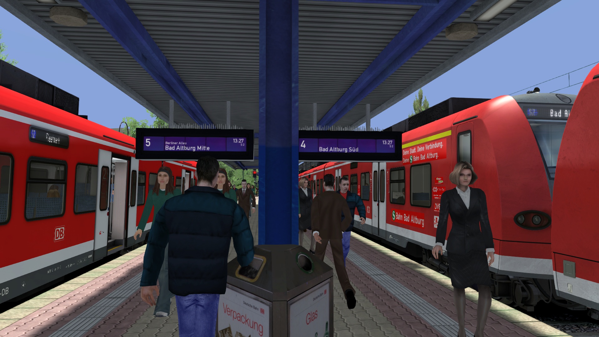 So ganz kapier ich das nicht. Ich soll um 13:12 in Colbitz sein aber krieg keine Ausfahrt weil ich auf diesen Gegenzug bis 13:15 warten muss. Warum lässt du den denn nicht gleich losfahren zu Szenariobeginn? Ob der in Bad Altburg brav am Bahnsteigende mit Stopmarkierung Passagiere lädt ist für den Spieler unerheblich weil ausser Sichtweite. Gib dem einen kurze Stopinstruktion zu Beginn und lass ihn dann gleich losfahren. Ist ein bisschen blöd wenn man 6 Minuten nichts zu tun und zu sehen hat am Szenarioanfang aber dann noch auf den engen Fahrplan hingewiesen wird