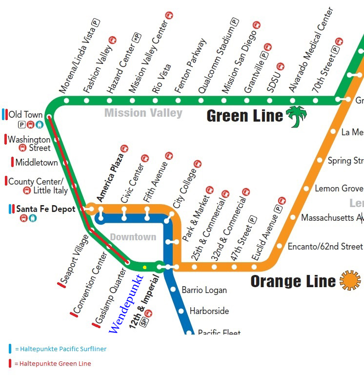 Die Fahrt geht vom Bahnhof "San Diego Old Town", bis zum Haltepunkt "San Diego Gaslamp Quarter".