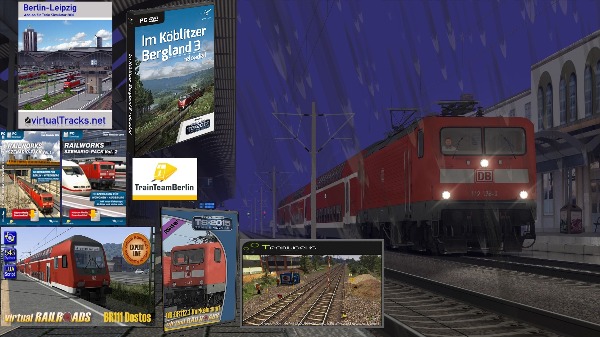 - Berlin-Leipzig,Im Köblitzer Bergland V3 - reloaded,TrainTeamBerlin Szenario-Pack Vol.1+2,virtualRailroads BR111 Dostos,virtualRailroads BR 112.1 Verkehrsrot