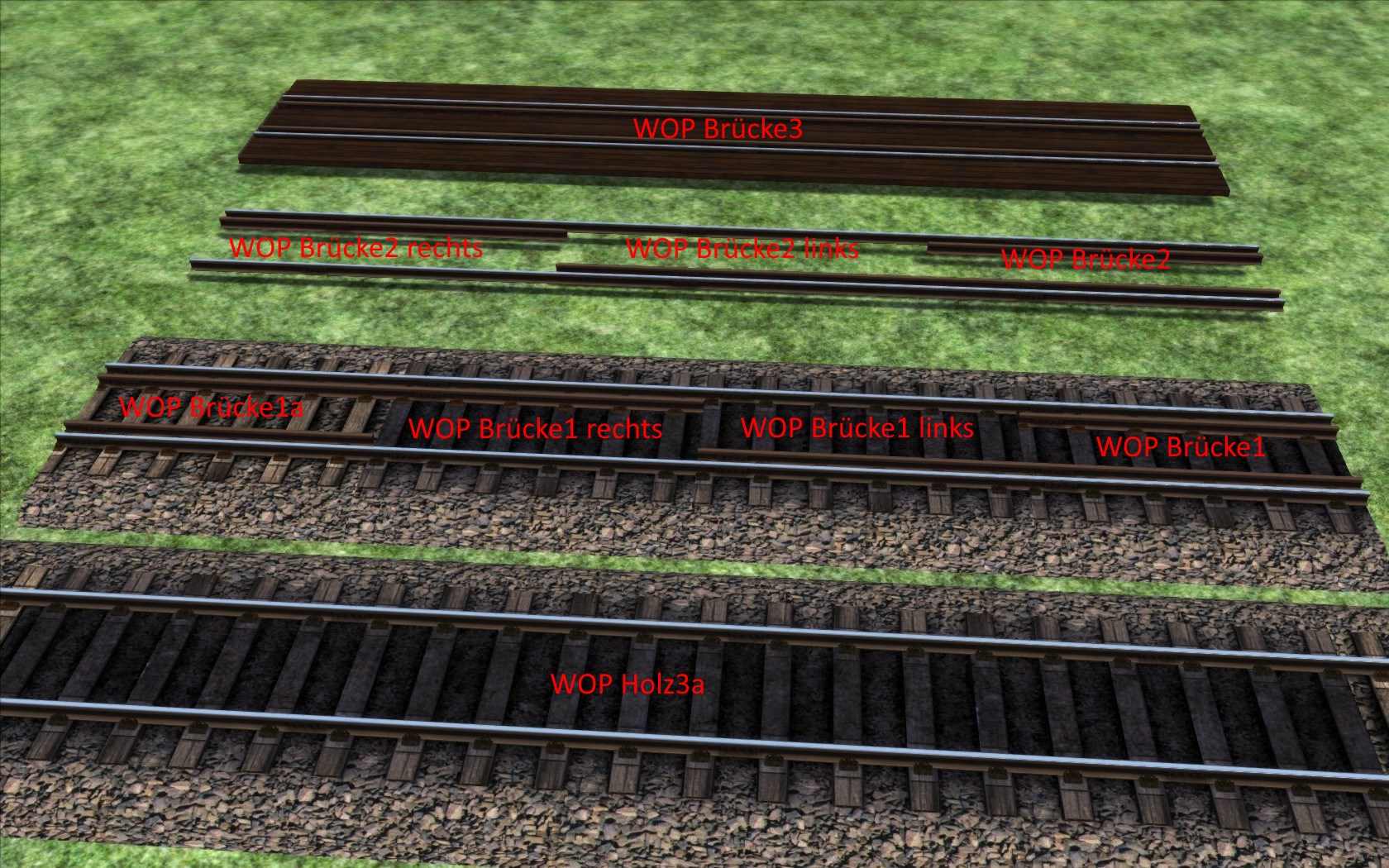 - Als Brückengleise gibt es die üblichen drei Abnutzungsgrade (blank, leicht benutzt und rostig)