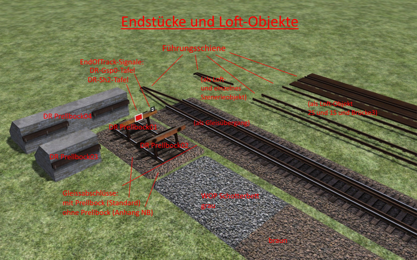 - 3.1: Texturen der Betonschwellen überarbeitet; Brückenlofts nun auch ohne Dammansatz und gänzlich ohne Widerlager enthalten, Vorbildgerechte Weichenhebel für Weichen und Kreuzungsweichen hinzugefügt, TrackRules angepasst und erweitert