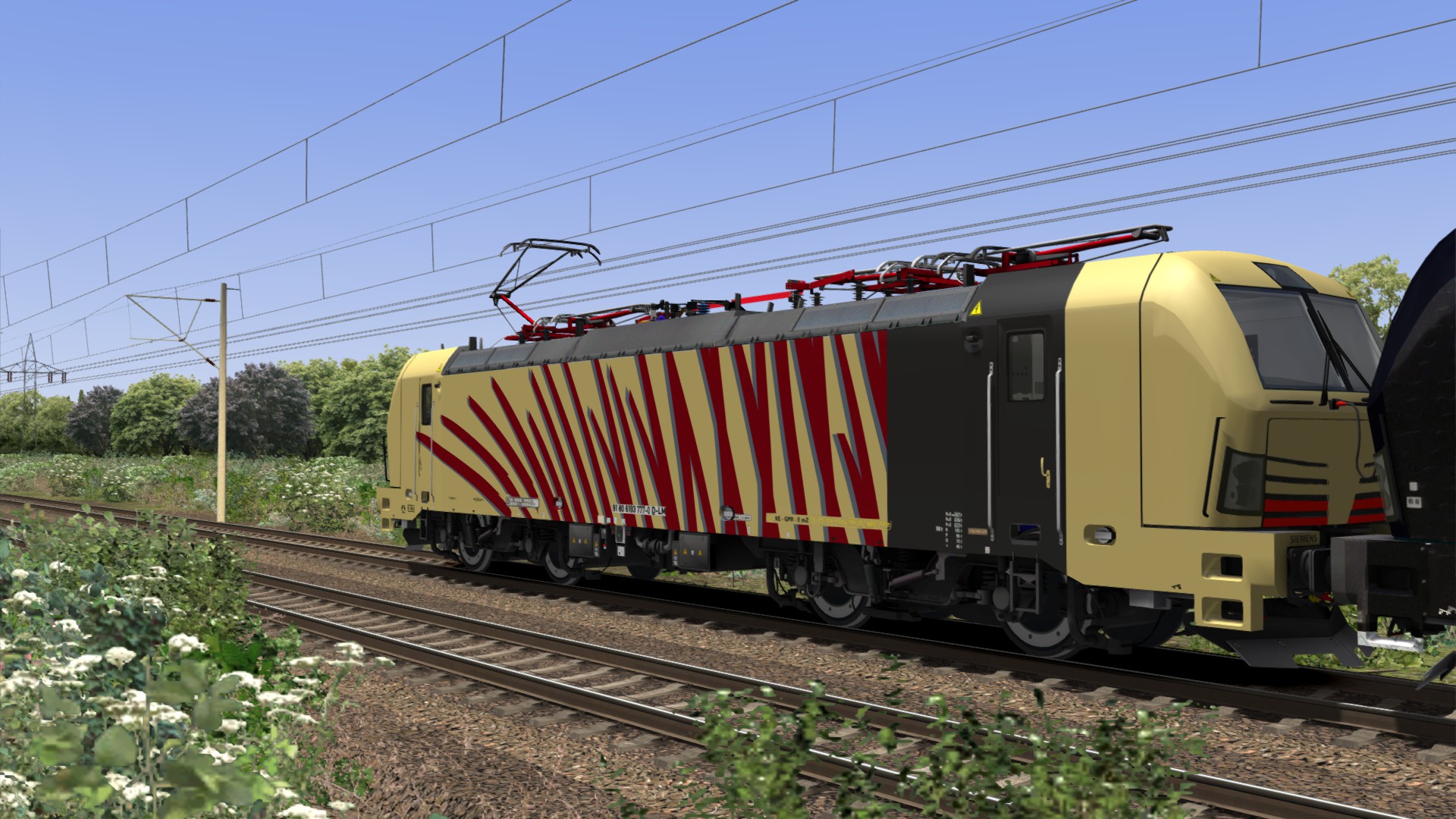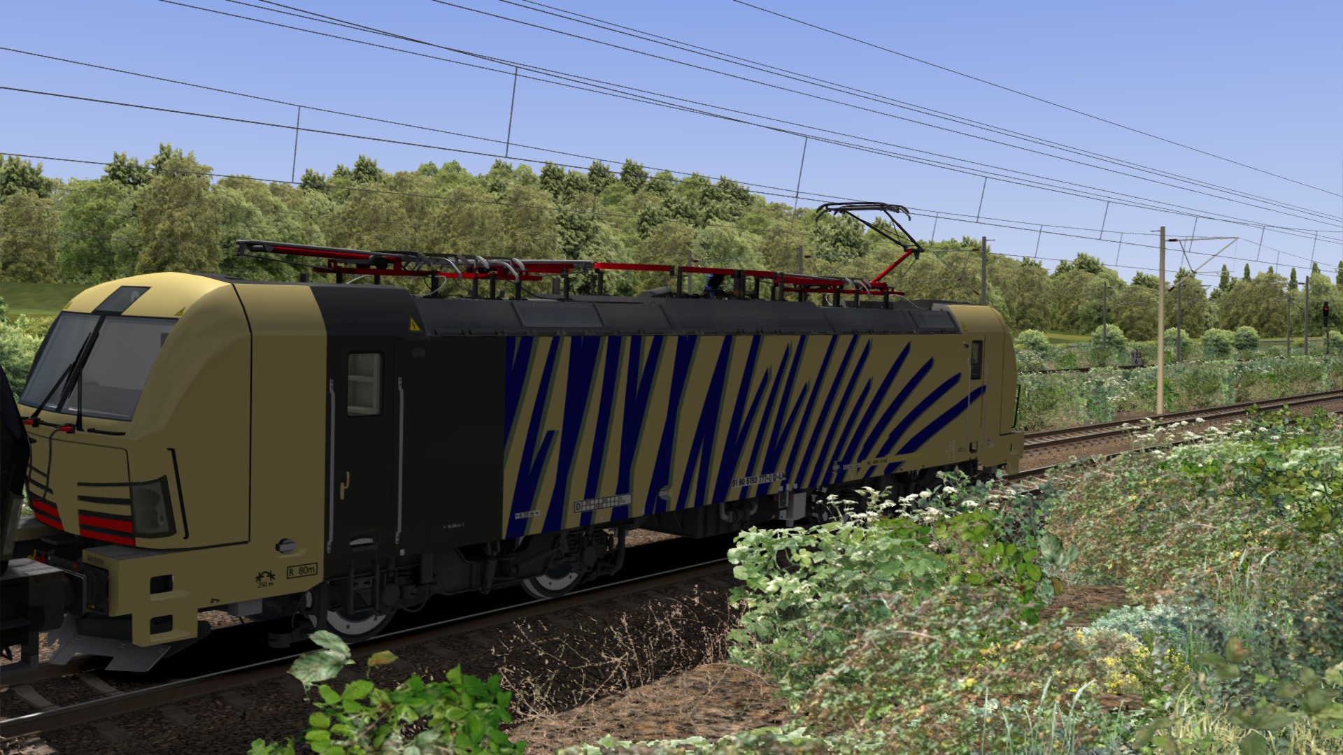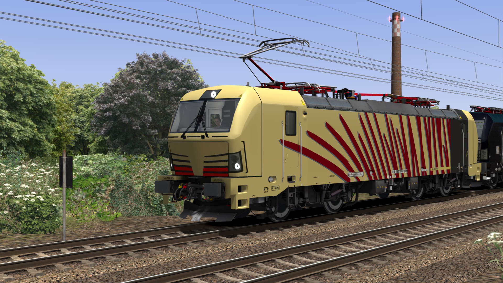 Dies ist ein Repaint für die beige Lokomotion Vectron mit roten und blauen Streifen.