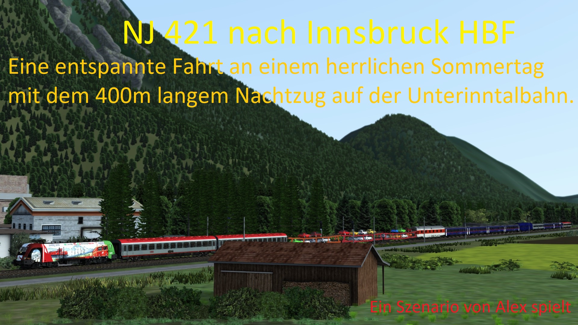 Was ein herrlicher Sommertag. Sie stehen gerade in Kufstein und übernehmen den NJ 421 auf seinen letzten Kilometern bis zu seiner Endstation Innsbruck HBF. Unterwegs werden Sie noch in Wörgl und Jenbach anhalten. Dieser Zug besteht genau genommen im Abschnitt München – Innsbruck aus 3 Teilen. Die letzten 5 Wagen kommen vom NJ 491 von Hamburg Altona, in der Mitte befinden sich 5 Nachtzug Wagen des NJ 421 von Düsseldorf, sowie aufgrund der hohen Auslastung 3 statt 2 Autotransporter, die auch von Düsseldorf kommen. In der Sommerzeit hat der Zug zusätzlich 2 Eurofima Wagen an der Spitze, diese führt der Zug, da aufgrund von Bauarbeiten der EC 81 in Innsbruck und nicht, wie normal in München startet. Somit verkehrt jetzt der NJ 421 zwischen München und Innsbruck mit 15 Wagen, gezogen von einer ÖBB Taurus der Reihe 1116. Sie übernehmen diesen Zug von Kufstein bis Innsbruck. Aufgrund der enormen Länge und der hohen Masse müssen Sie mit längeren Beschleunigungs- und Verzögerungsstrecken rechnen. Diese sind aber natürlich schon im Fahrplan eingerechnet und somit sollte Ihnen eine entspannte Fahrt bevorstehen.