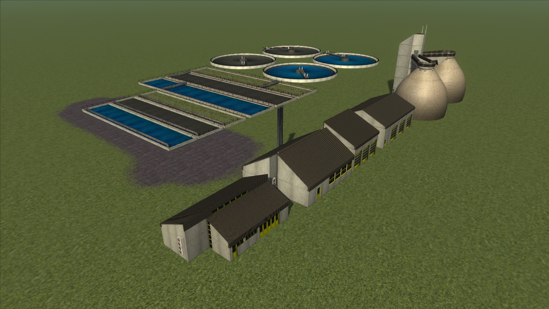 Ein Bauset für eine Kläranlage bestehend aus verschiedenen Klärbecken, Faultürmen und Gebäuden