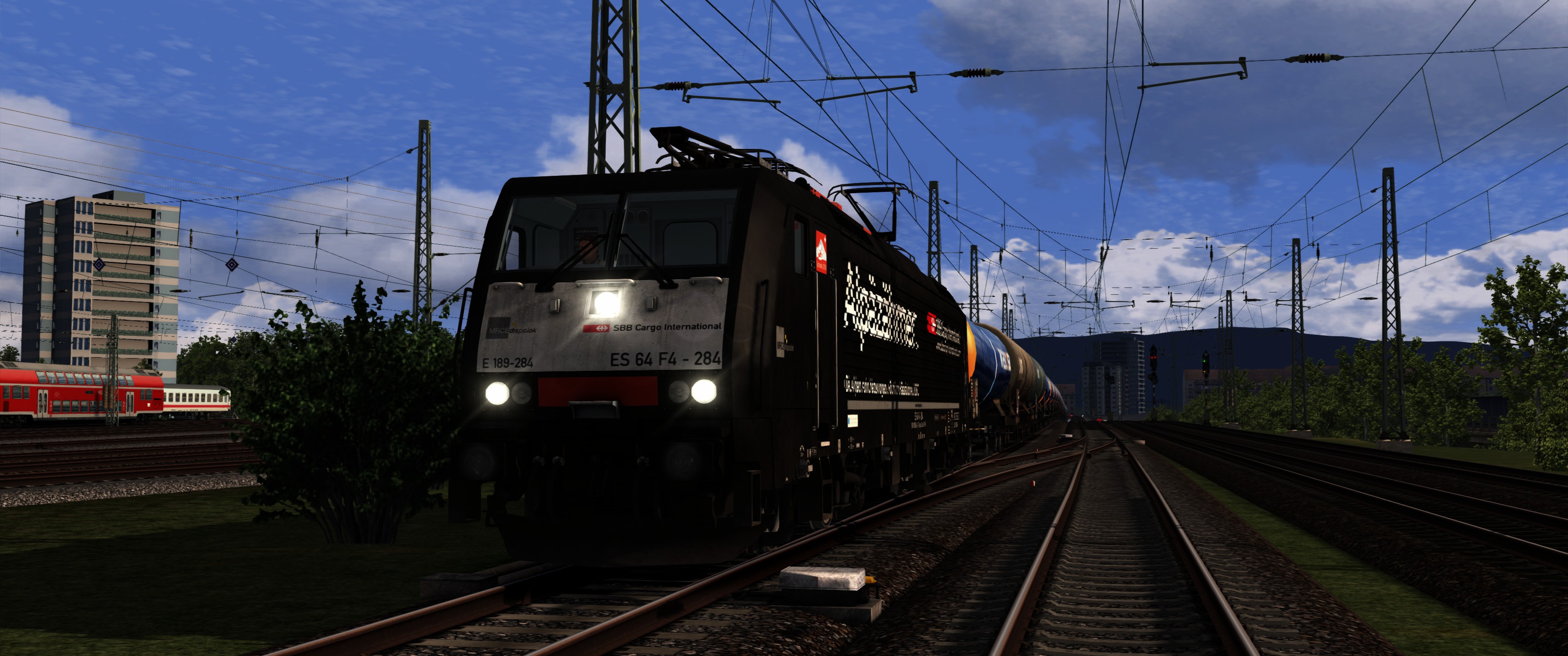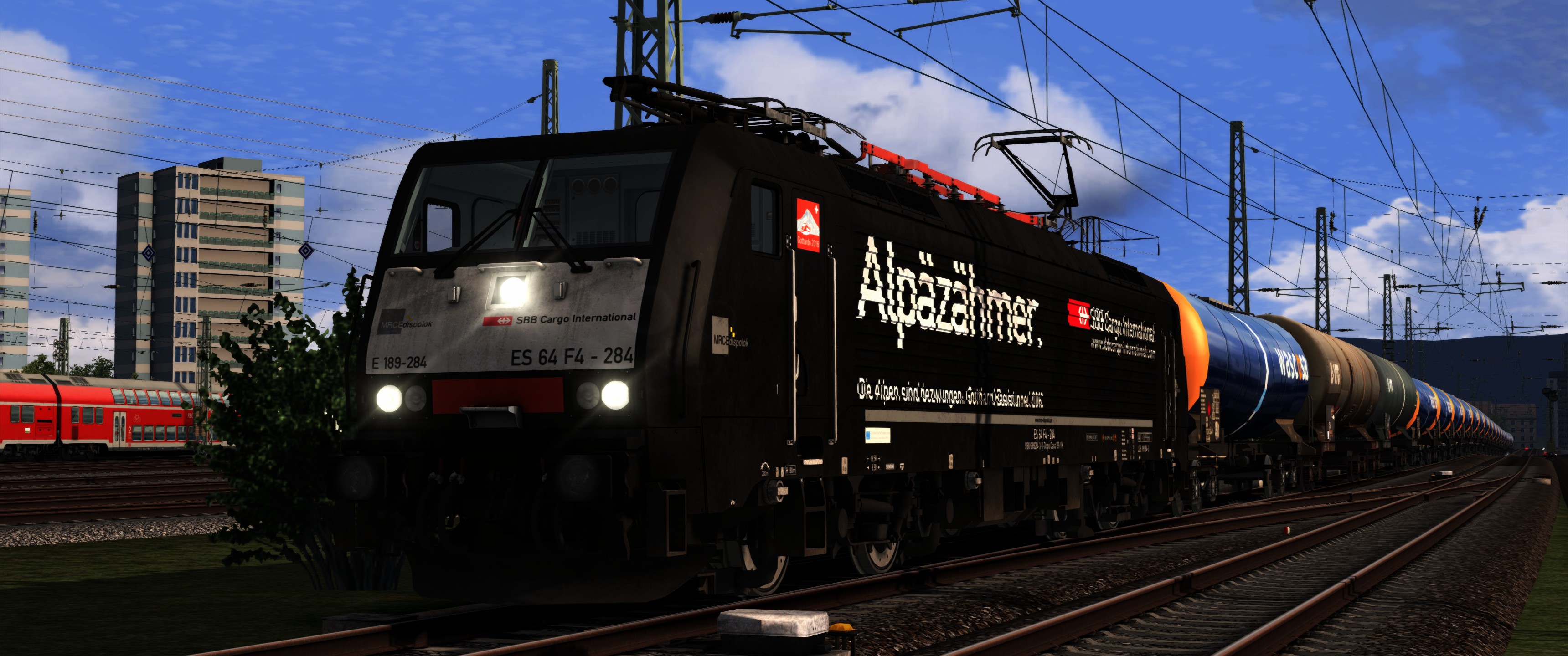 Du fährst am 24.07.2018 einen leeren Kesselzug Bespannt mit MRCE/SBBCI ES 64 F4-115 (189 115-9) "Alpäzähmer" aus Richtung Schweiz kommend weiter in Richtung Norden. Bleibe bitte beim Start des Szenarios noch 3 Minuten vor dem Signal stehn! (Siehe F1-Fenster)