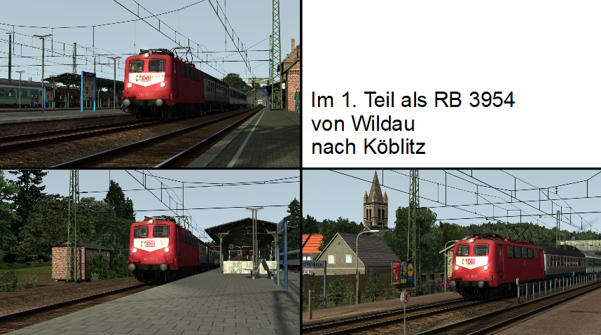 Im meinem zweiteiligen Szenario geht es zuerst mit der vR BR 141 Orot von Wildau nach Köblitz, ca. 30 min. später mit einem 628 zurück richtung Wildau.