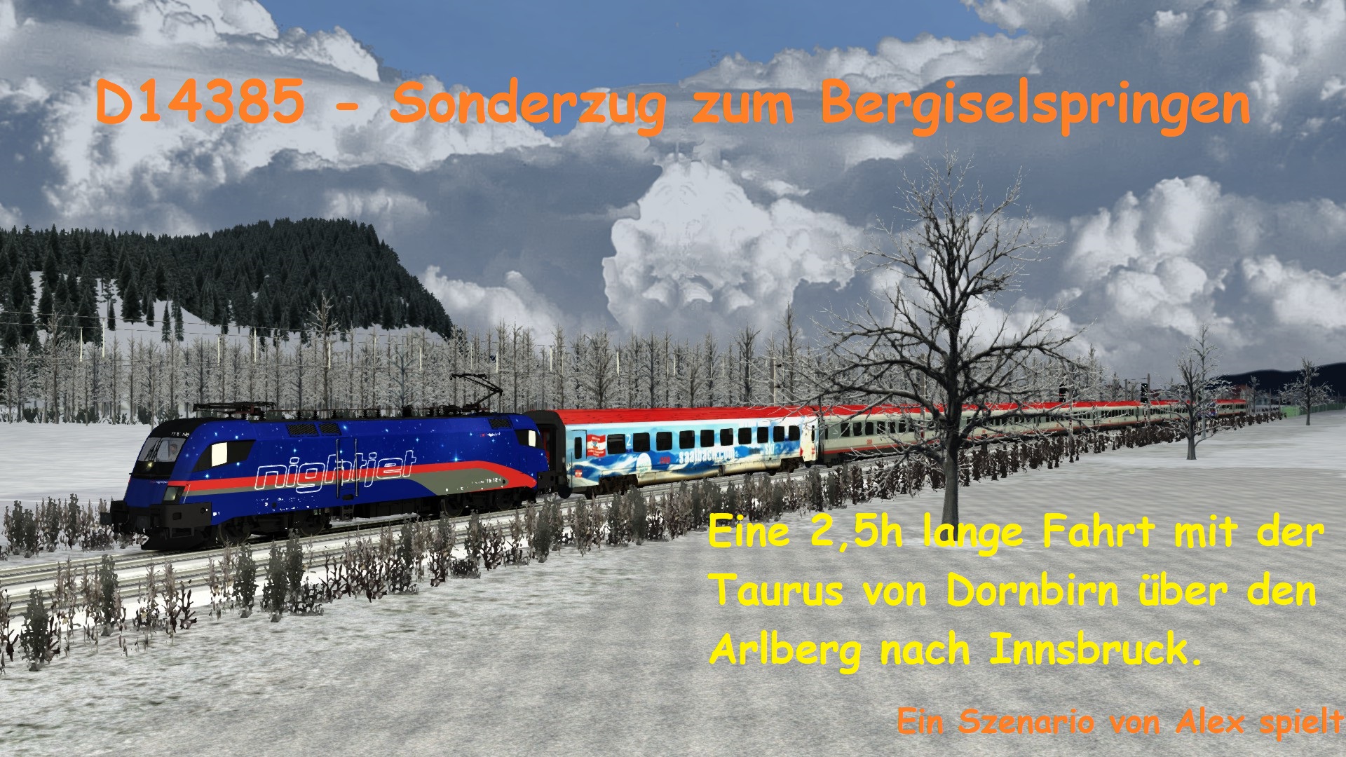 Jedes Jahr findet am 4. Jänner das Bergiselspringen in Innsbruck im Zuge der Vierschanzentournee statt. Wie auch schon die letzten Jahre wird auch dieses Jahr wieder mit einem sehr hohen Zuschaueraufkommen gerechnet. Viele von den über 10.000 erwarteten Zuschauern werden auch mit den Zügen anreisen. Somit setzt die ÖBB auch dieses Jahr wieder Sonderzüge ein. Sie übernehmen einen dieser Sonderzüge. Ihre Fahrt beginnt in Vorarlberg, genauer gesagt in Dornbirn und führt sie durch das Rheintal über den Arlberg bis nach Innsbruck. Auf dieser über 2,5h langen Fahrt werden Sie auch an einigen Bahnhöfen halten, um Fahrgäste ein- und aussteigen zu lassen. Ihre Zugnummer lautet D14385. Das Wetter ist gut, Störungen sind keine bekannt, somit sollte es für Sie eine entspannte Fahrt werden.