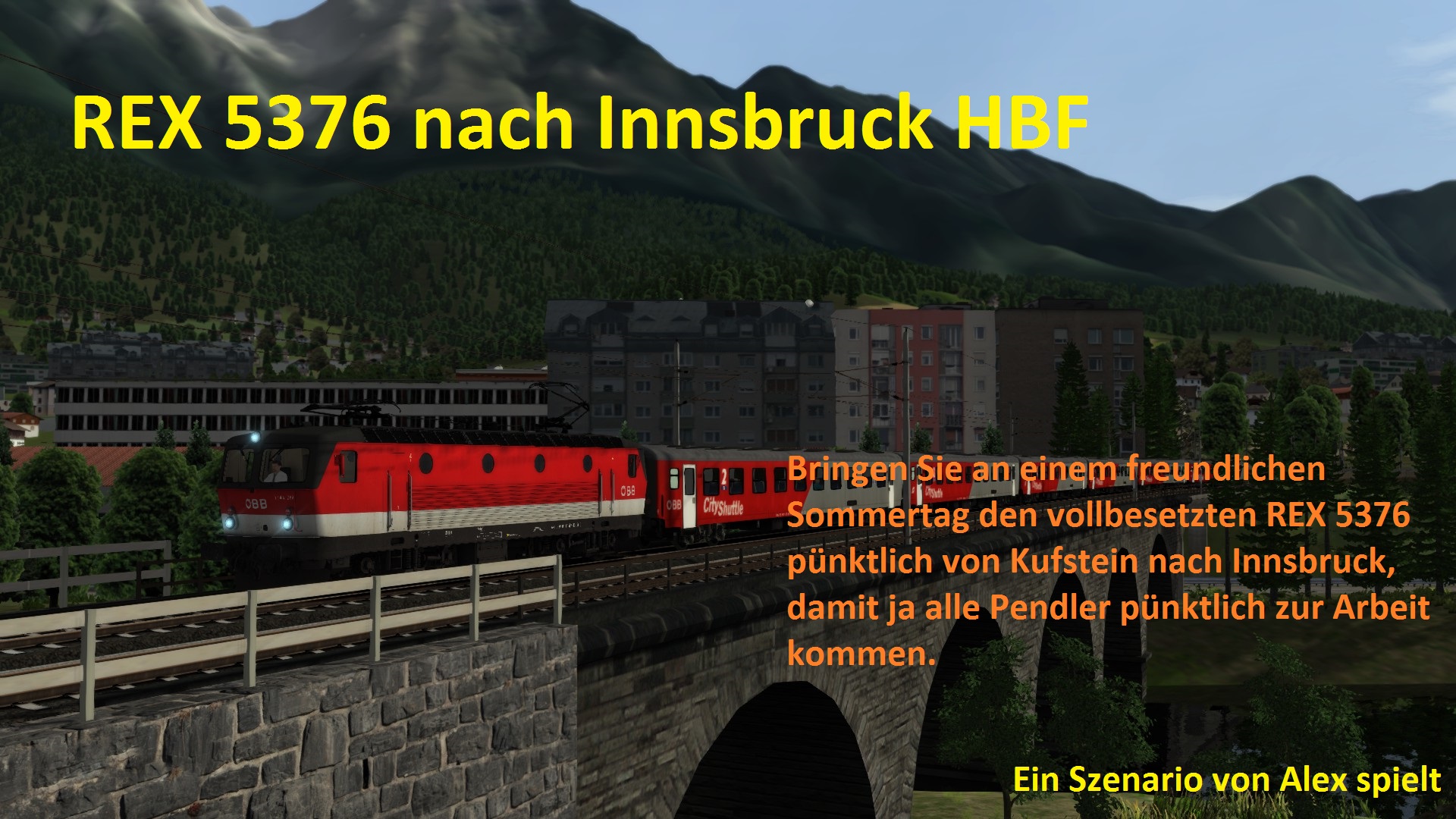 Der REX 5376, ein Regionalzug der täglich am Morgen zwischen Kufstein und Innsbruck verkehrt, ist ein Zug, der vor allem während der Schulzeit stark ausgelastet ist.Abseits der Schüler nützen auch sehr viele Pendler diesen Zug,sodass dieser Zug immer pünktlich sein sollte, damit alle Fahrgäste pünktlich zur Arbeit kommen. Bis zum Fahrplanwechsel im Dezember 2017 verkehrte dieser Zug als Talent Doppelgarnitur. Seither als CityShuttle Wendezug mit einerÖBB 1144 an der Spitze und 6 CityShuttle Wagen am Haken. Der Grund für den Wechsel war, dass aufgrund der stetig gestiegenen Fahrgastzahlen, diein den Spitzenzeitenbenötigten Kapazitäten nur mit Talent Triebwagen allein nicht mehr abgedeckt werden konnten. Sie übernehmen diesen Zug heute auf seiner kompletten Fahrstrecke von Kufstein nach Innsbruck. Anschließend in Innsbruck müssen Sie diesen Zug auch noch zur Abstellung bringen.
