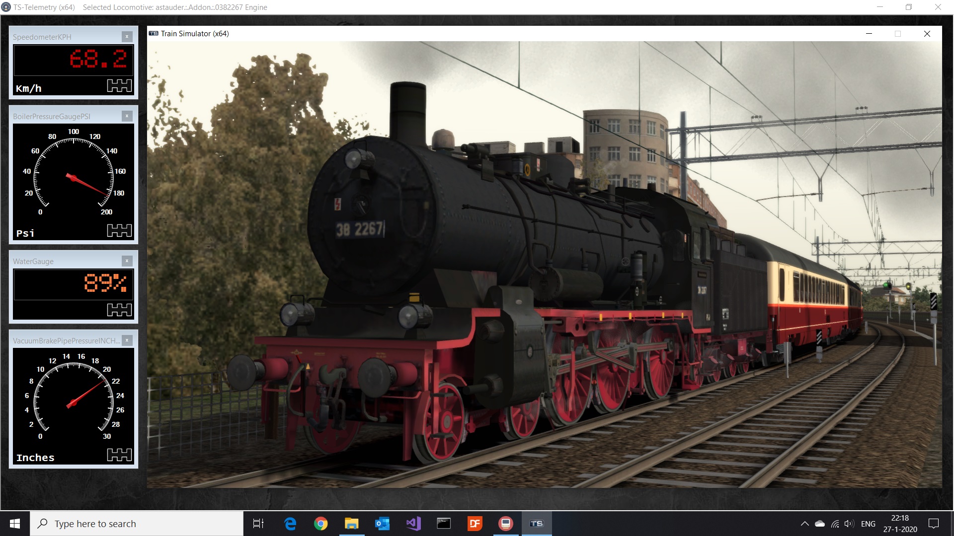 TS-Telemetry is an application that makes it possible to show locomotive gauges outside Train Simulator or send the values to a Dash Board application like SimHub. In order to do so TS-Telemetry uses the RailDriver64.DLL provided with Train Simulator. TS-Telemetry also has his own gauges meaning it can be used without a Dash Board application, i.e. stand alone.