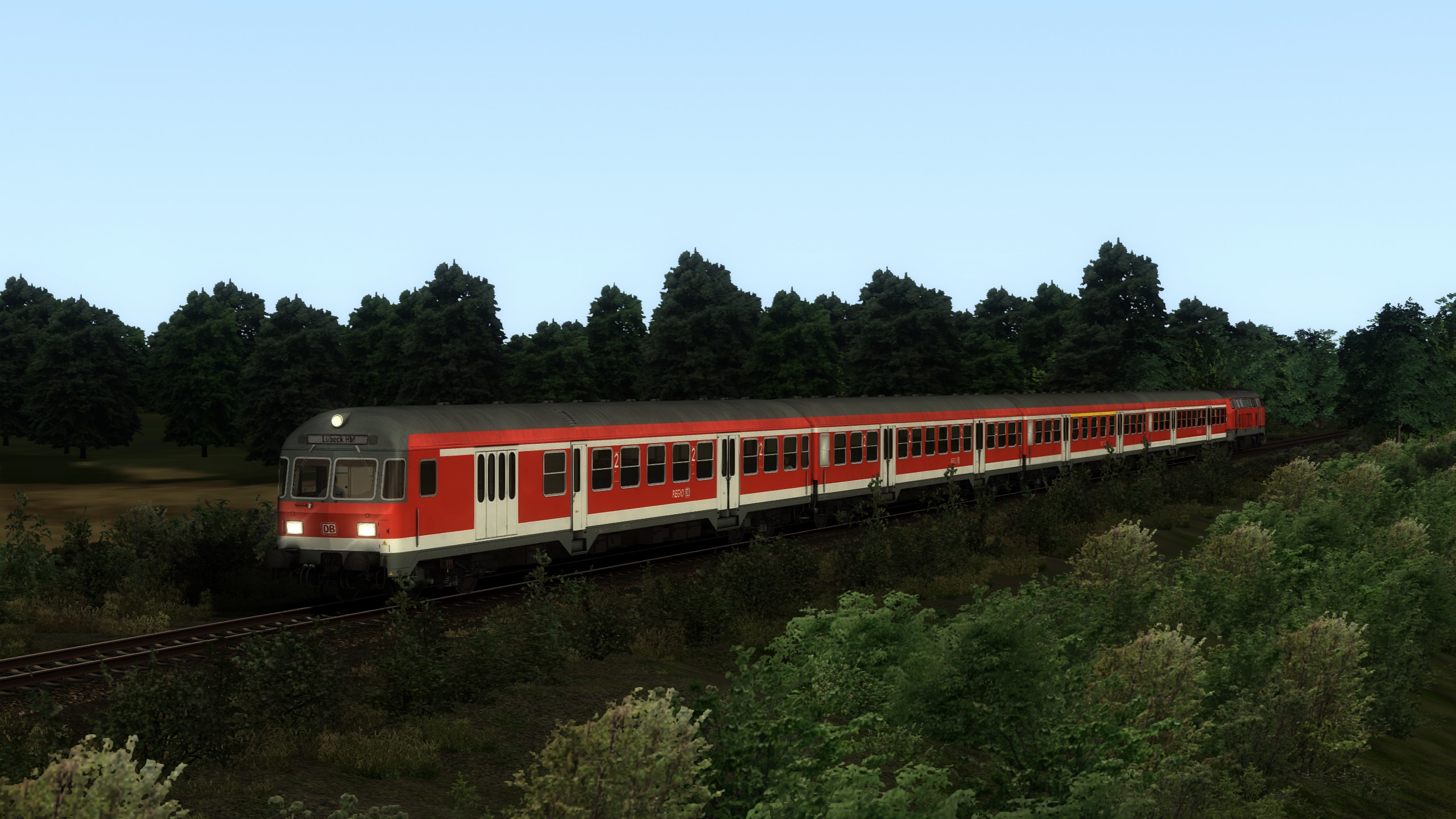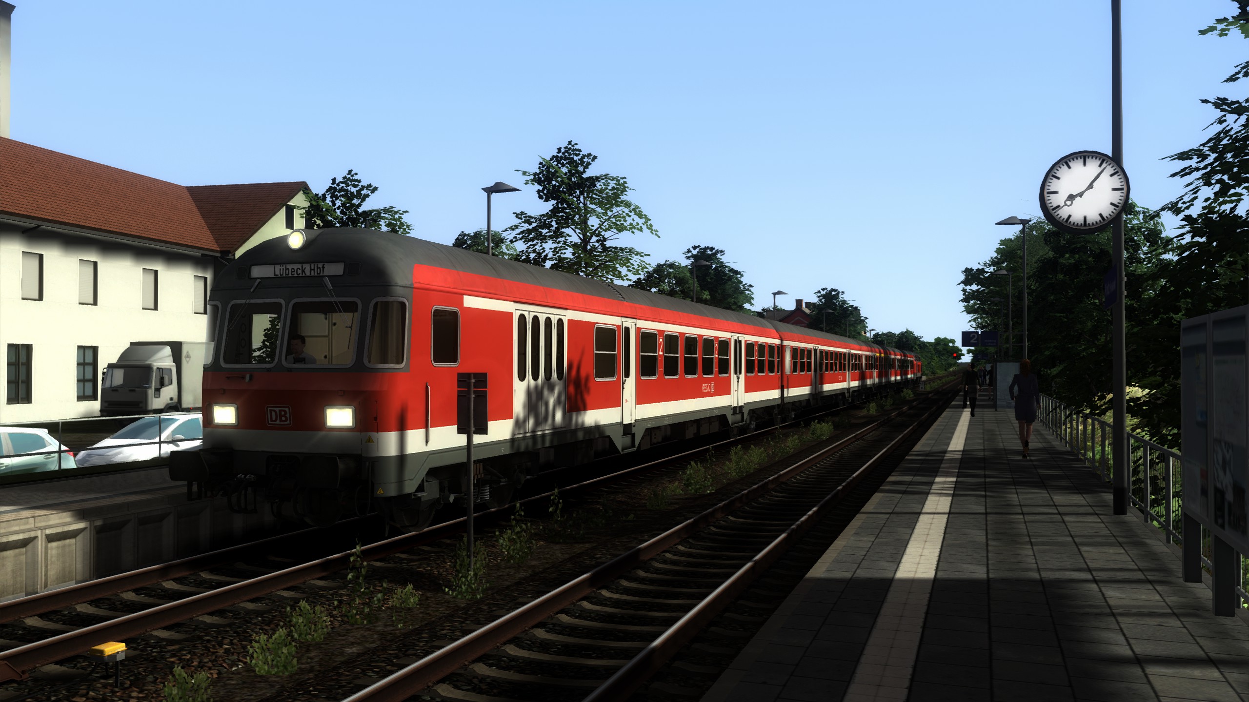 Du fährst eine N-Wagen Garnitur auf der RB 84 nach Lübeck. Dein Spielerzug verkehrt nach einem realen Fahrplan (RB 21661). Die KI-Züge fahren zum Teil nach einem echten Fahrplan. Güterzüge sind fiktiv.