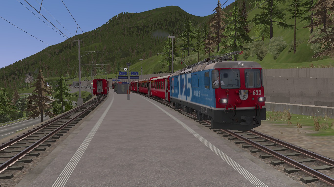 In diesem Szenario fahren Sie einen RE von Sagliains nach Scuol-Tarasp. Ihr Fahrzeug ist heute ein lokbespannter RE-Zug mit einer Ge 4/4 II. Das Szenario dauert etwa 25 Minuten. Der Personen-KI-Verkehr ist der Realität nachempfunden.