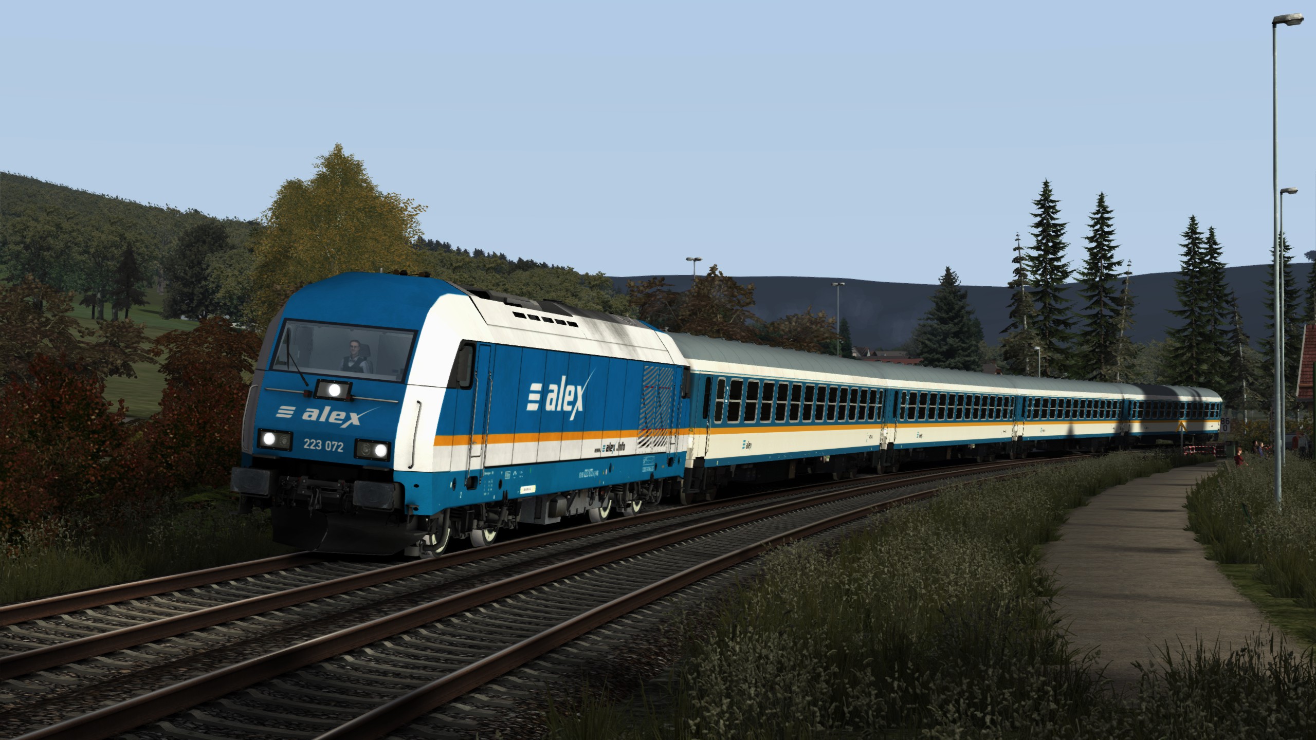 Du fährst an diesem nebligen Morgen den ALX 84105 nach München auf dem Abschnitt Lindau bis Kempten.Alle Züge fahren nach einem realen Fahrplan. Es ist also wie auf der Allgäubahn üblich. nur mäßiger Verkehr.