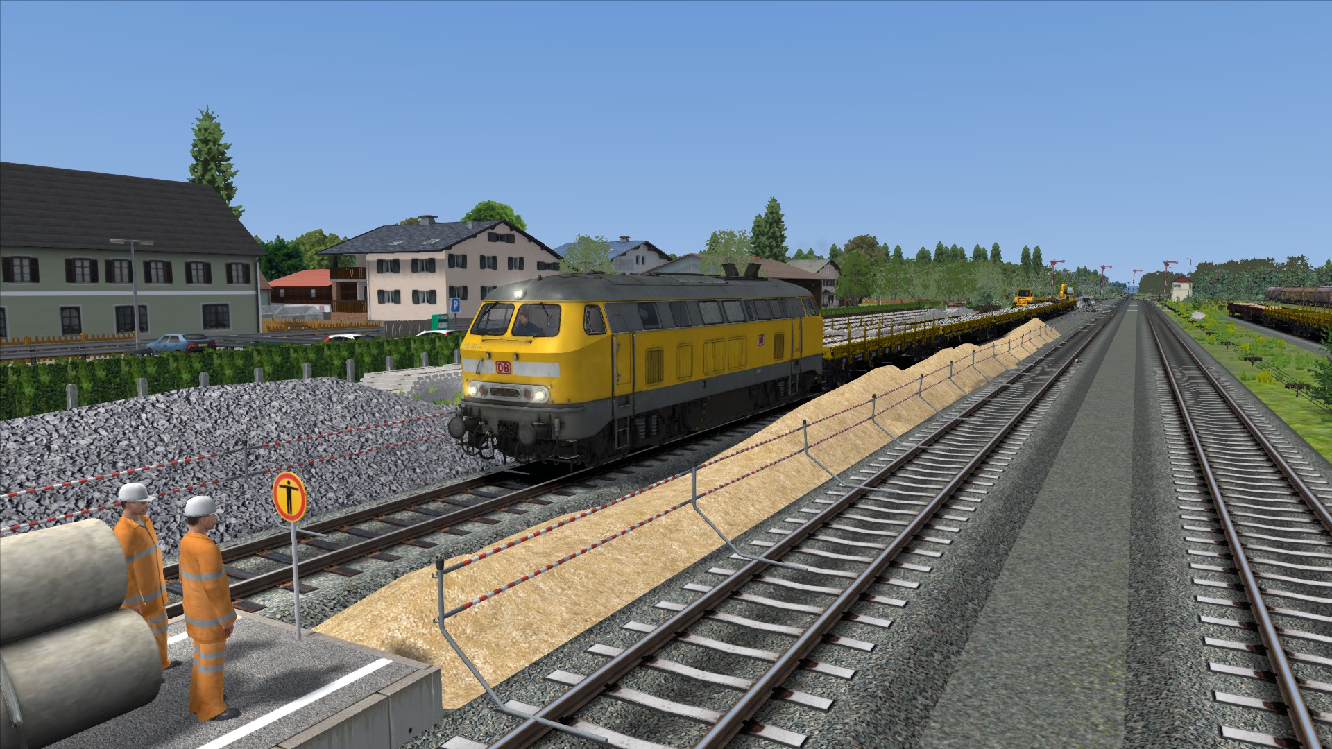 In Garching wird aktuell der Bahnhof renoviert und die Gleise erneuert. An diesem schönen Sommertag fährst du einen Bauzug zur Baustelle, holst dort ein paar Wagen ab und fährst sie zurück nach Mühldorf. Deine Lok ist noch kalt und muss aufgerüstet werden. Wenn du soweit bist, darfst du zu den Wagen fahren und sie ankuppeln. Folge anschließend den Anweisungen des Weichenwärters und Fahrdienstleiters.