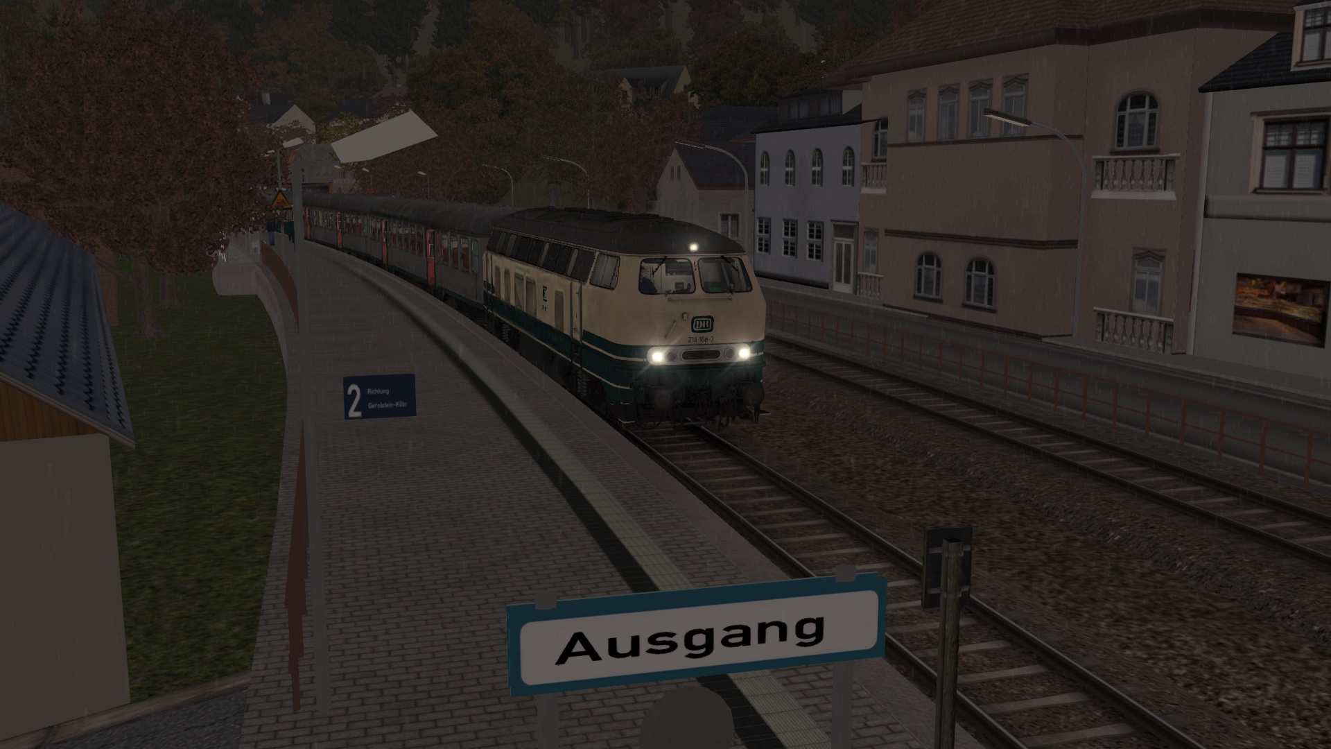 Rüste deine Diesellok auf und lasse die Fahrgäste einsteigen, damit du planmäßig um 07:44 Uhr deine Fahrt in die Eifel antreten kannst.