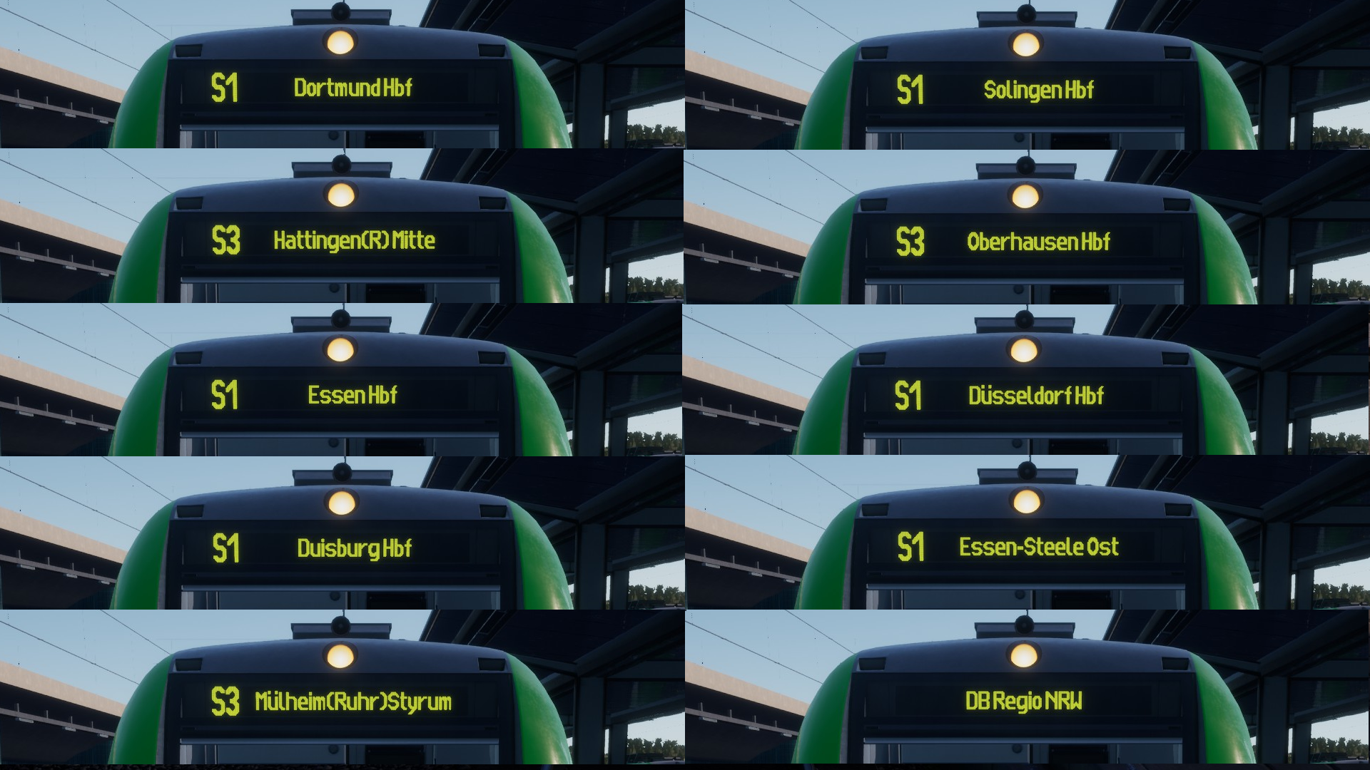 Mit dieser Mod wird ein Großteil der Zugziele der BR 422 aus HRR überarbeitet. So haben viele Ziele jetzt wie in der Realität ein "Hbf" hinten dran (z.B. Dortmund Hbf), Ziele wie "Hattingen(R) Mitte" werden an die tatsächliche Darstellung angepasst und ich habe für die S1 und S3 einige weitere Ziele hinzugefügt, die am besten im Szenariogestalter eingesetzt werden können. Außerdem wird "Nicht einsteigen" durch "DB Regio NRW" ersetzt, so dass bei fehlenden Zielen nicht mehr überall "Nicht einsteigen" geschildert wird. "Nicht einsteigen" ist natürlich weiterhin in der Liste enthalten, jetzt aber an anderer Stelle.