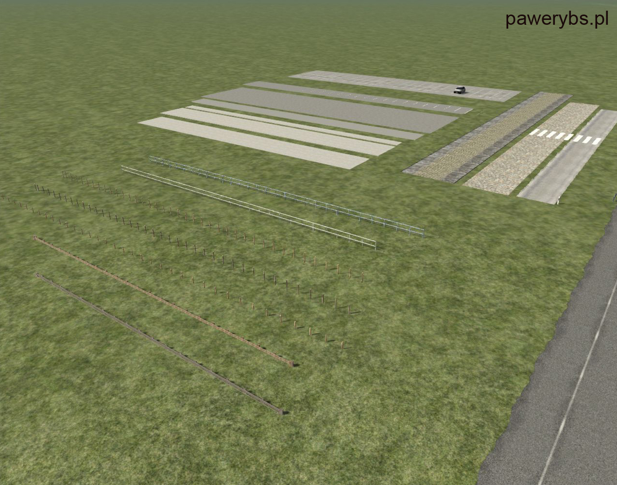 EN: The package contains 21 loft models for use in RailWorks/TrainSimulator: a continuation of different asphalt objects and pavements, new fences (pasture fences) and barriers, simple parking lofts, streets (without traffic) and road elements.