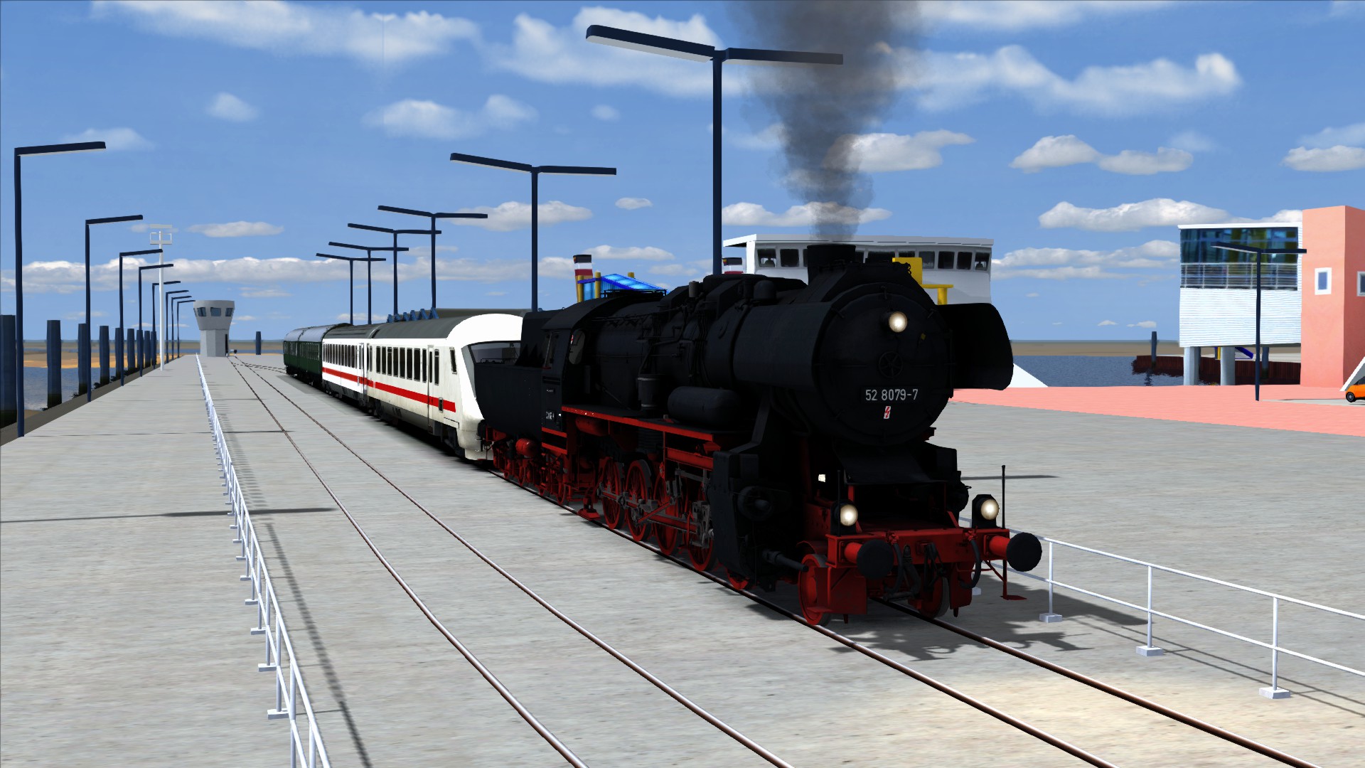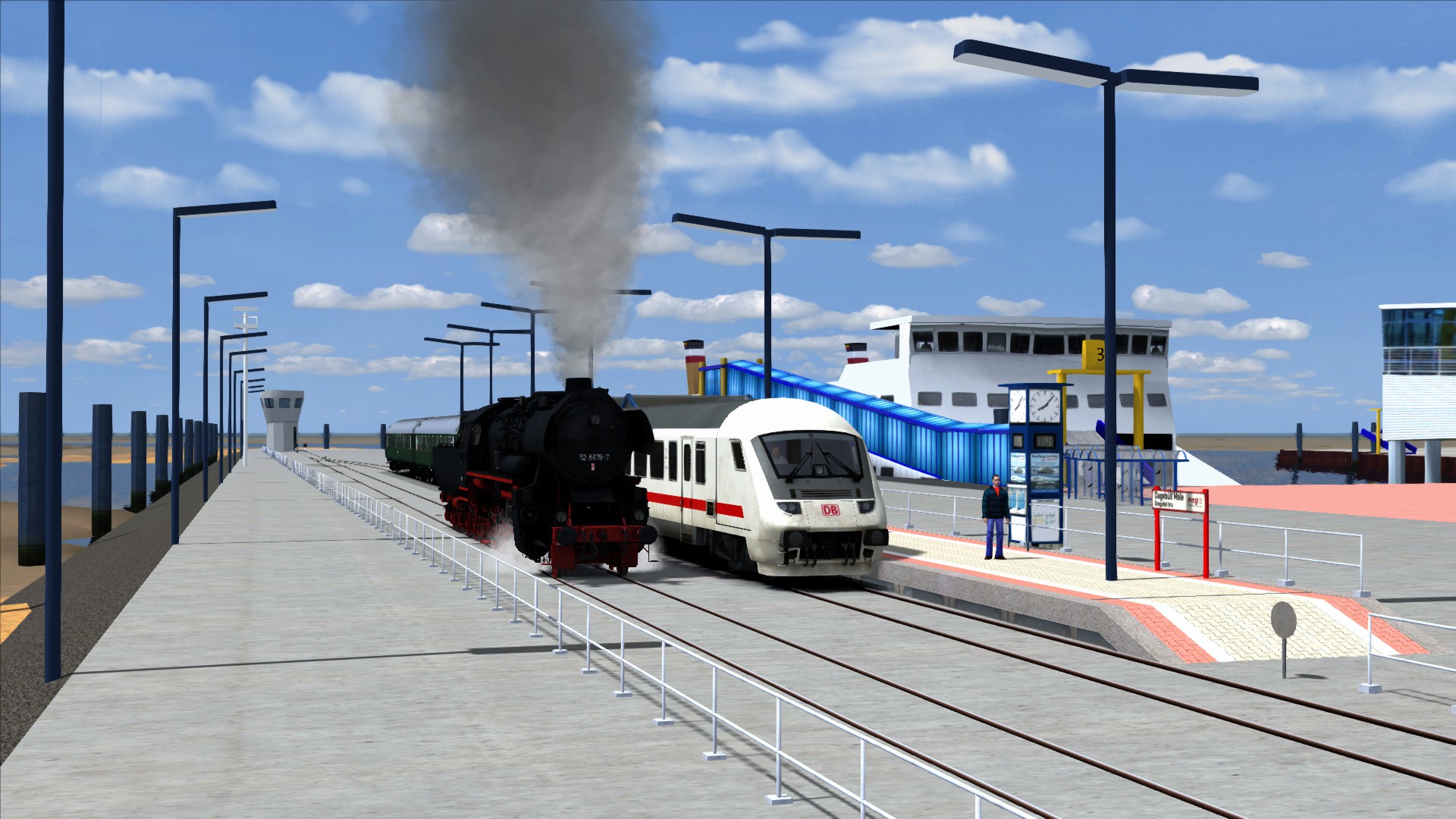 Im Sommer 2008 war die Nossener 52 8079 bei der NEG um dort die Kurswagen der Intercitys von Niebüll nach Dagebüll Mole zu befördern. In diesen beiden Teilen fährst du den IC 2074 von Niebüll NEG nach Dagebüll Mole und im im zweiten Teil dann den IC 2075 wieder zurück nach Niebüll. Auf den Hinweg zum Meer hälst du dabei an jedem Bahnsteig und auf den Rückweg fährst du mit Volldampf durch.