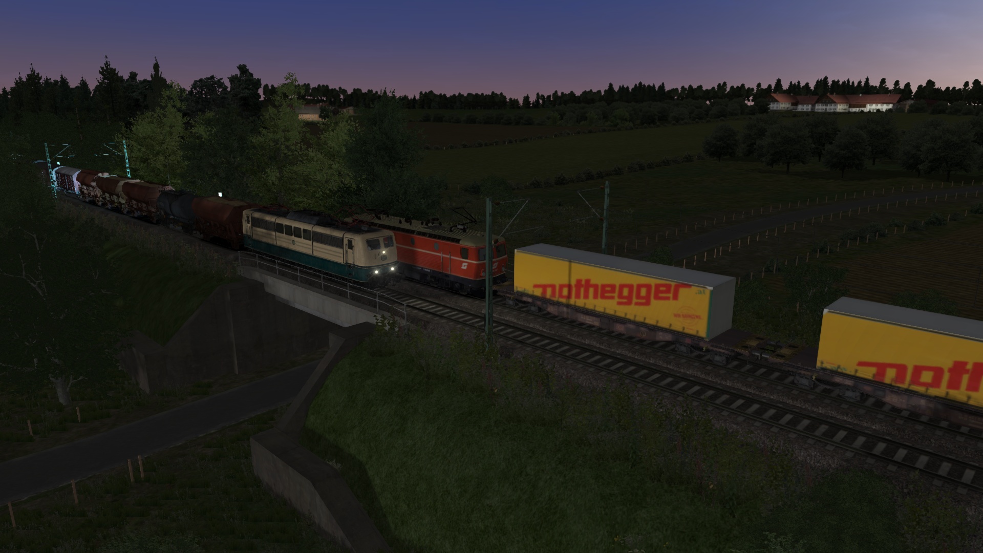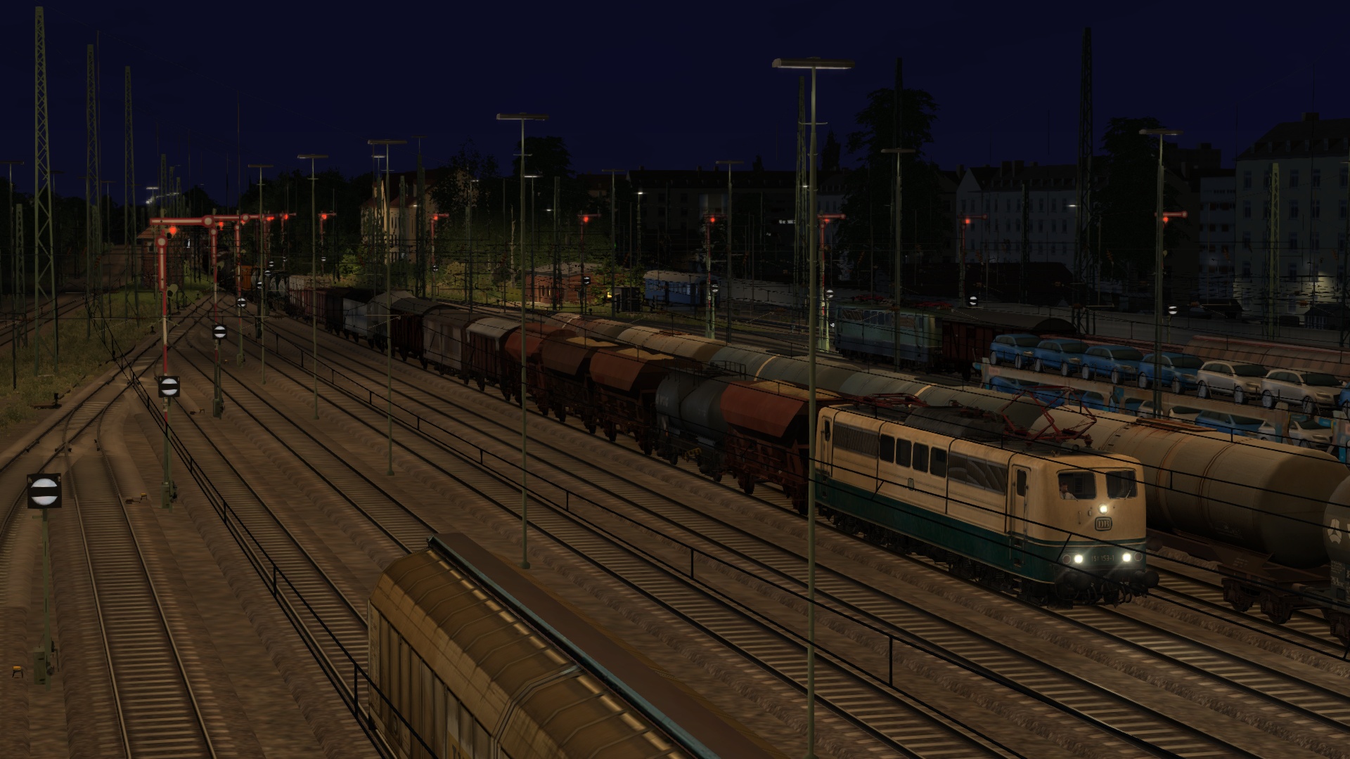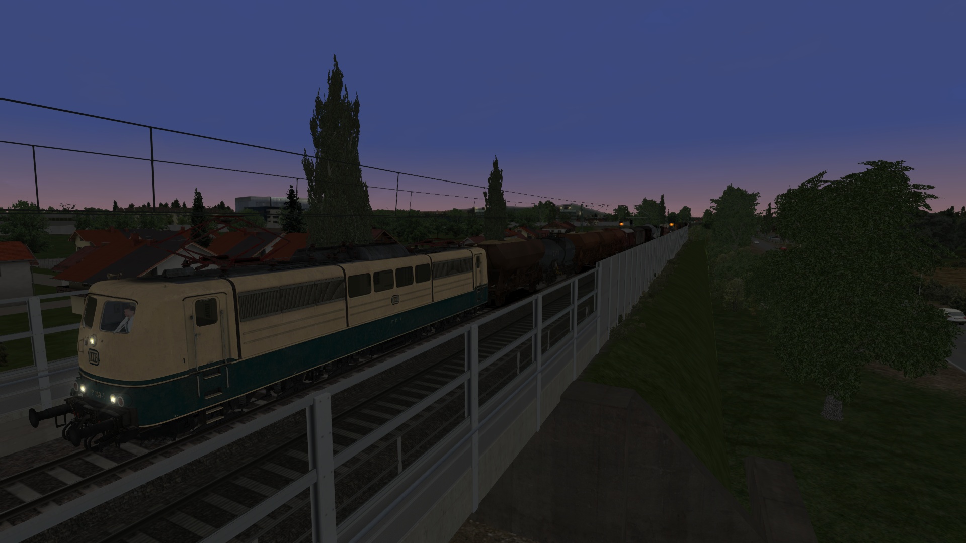Nutze nun die kurze Wartezeit für das vollständige Aufrüsten deiner E-Lok (PZB-Zugart M, Vmax = 100 km/h) und bereite dich auf die Abfahrt in die Nacht vor.