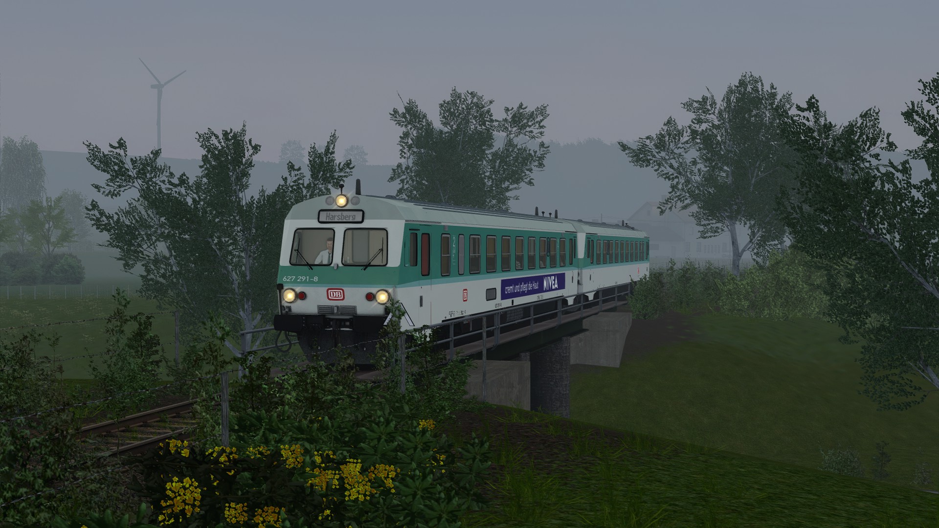 An diesem nebligem Sommermorgen bringst du die erste Regionalbahn des Tages von Kerpen über Frutenhof und Mittelwaid nach Harsberg.