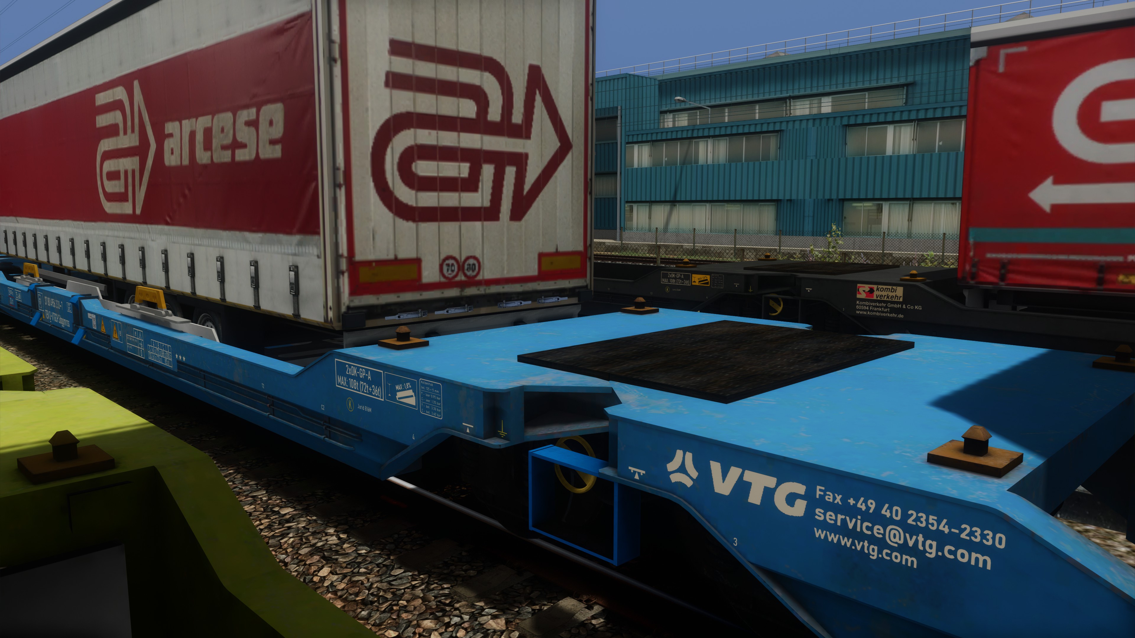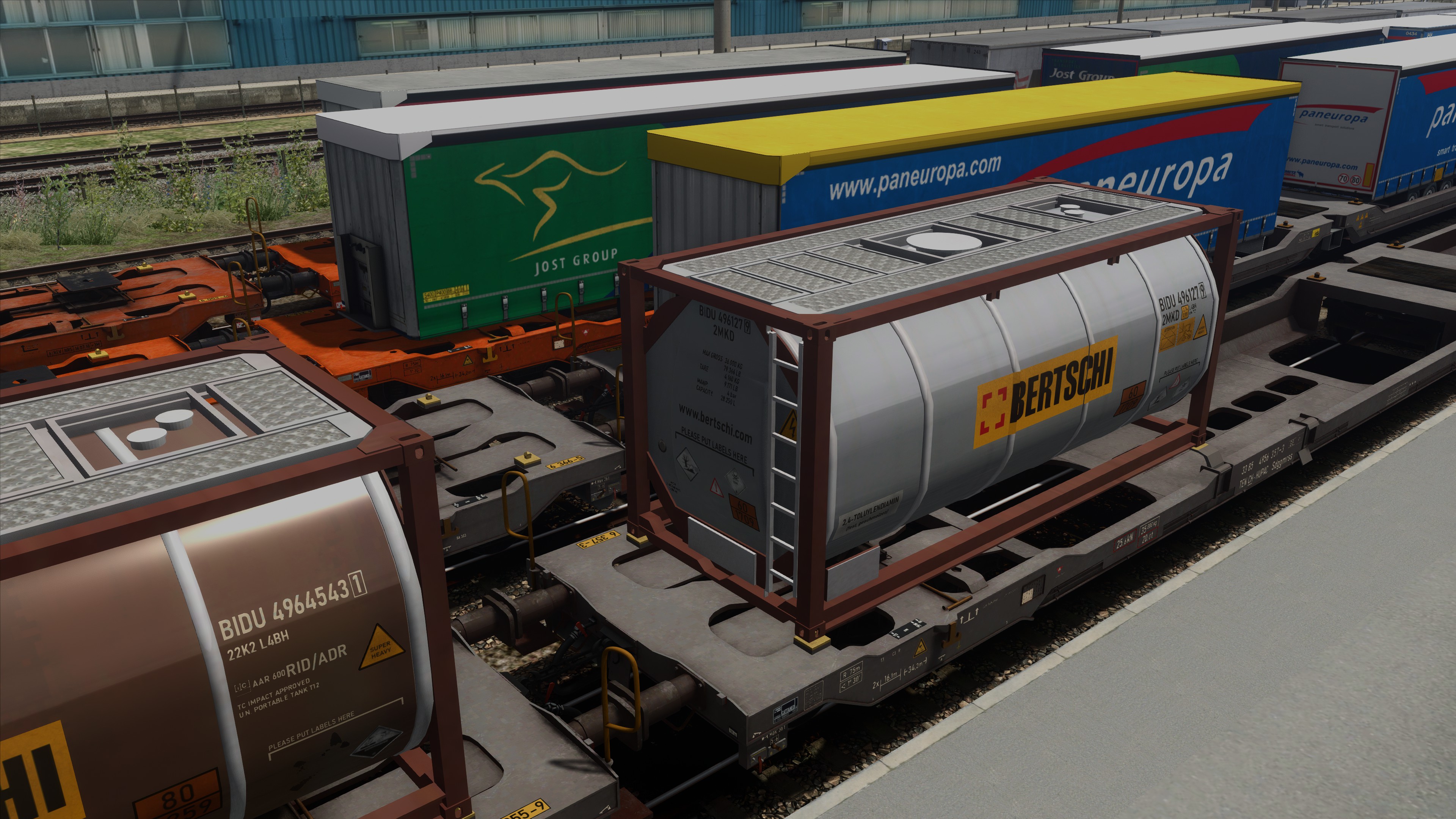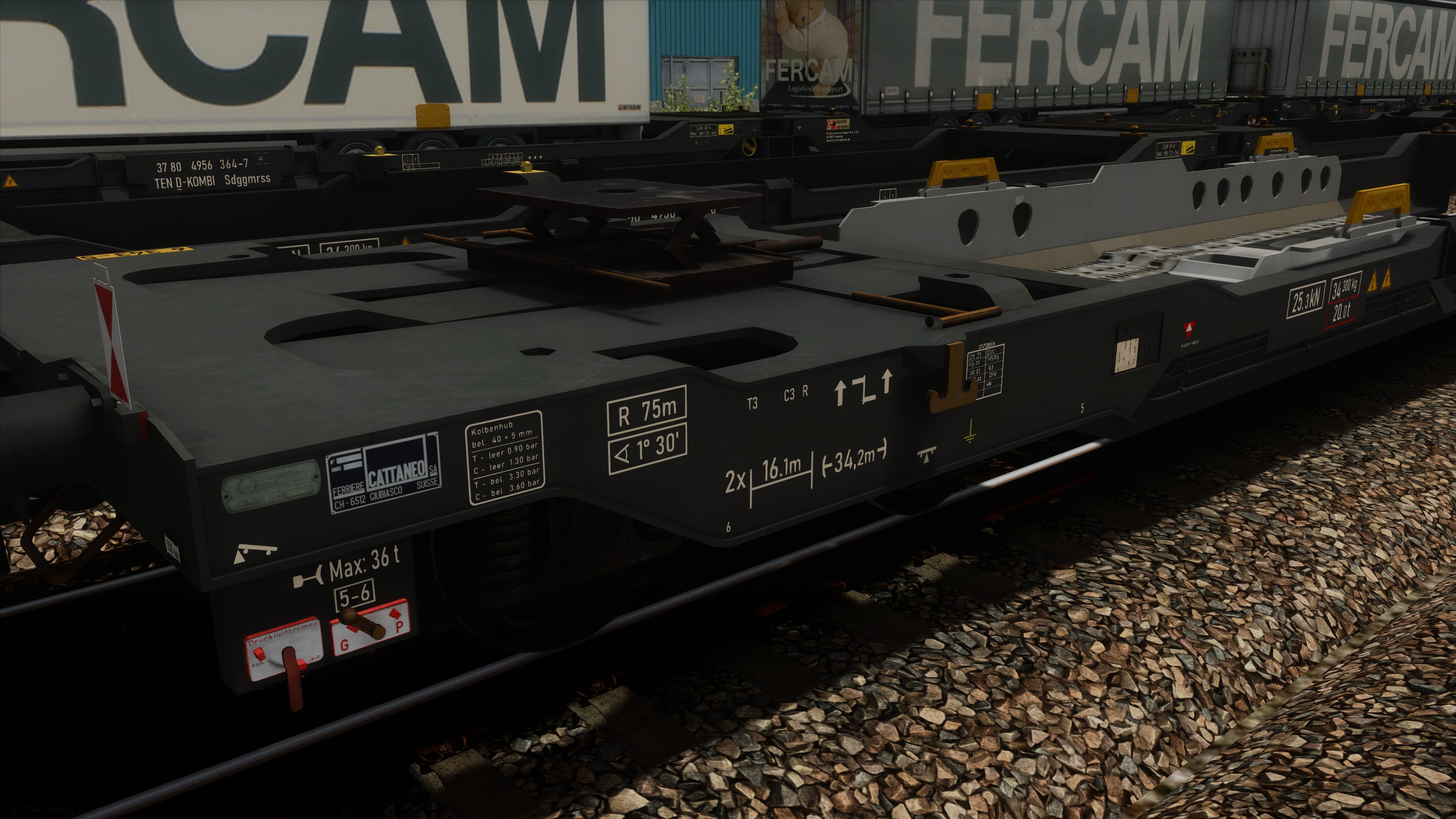 Unter anderen erhielten die Wagen so komplett neue, realitätsgetreu positionierte Beschriftungen (inkl. korrekte Wagennummern sowie Beschriftungen an Ober- und Stirnseiten), ein Handbremsrad beim Mitteldrehgestell sowie zusätzliche Klappriegel für 40- und 20-Fuss-Container /-Wechselbehälter. Für zusätzliche realitätsgetreue Beladungsvarianten werden die Auflieger von RDF sowie zusätzliche darauf aufbauende Varianten mitgeliefert. Herzlichen Dank für die Erlaubnis zur Verwendung! Weiter sind Tanktainer der Firma Bertschi und Wechselbrücken verschiedener Firmen enthalten, ebenso Bahnladungsträger (Road-Rail-Link / R2L) zum Verlad nicht-krankbarer Auflieger (Modelle: ronald_cn, Texturen: FortyCS und ronald_cn).