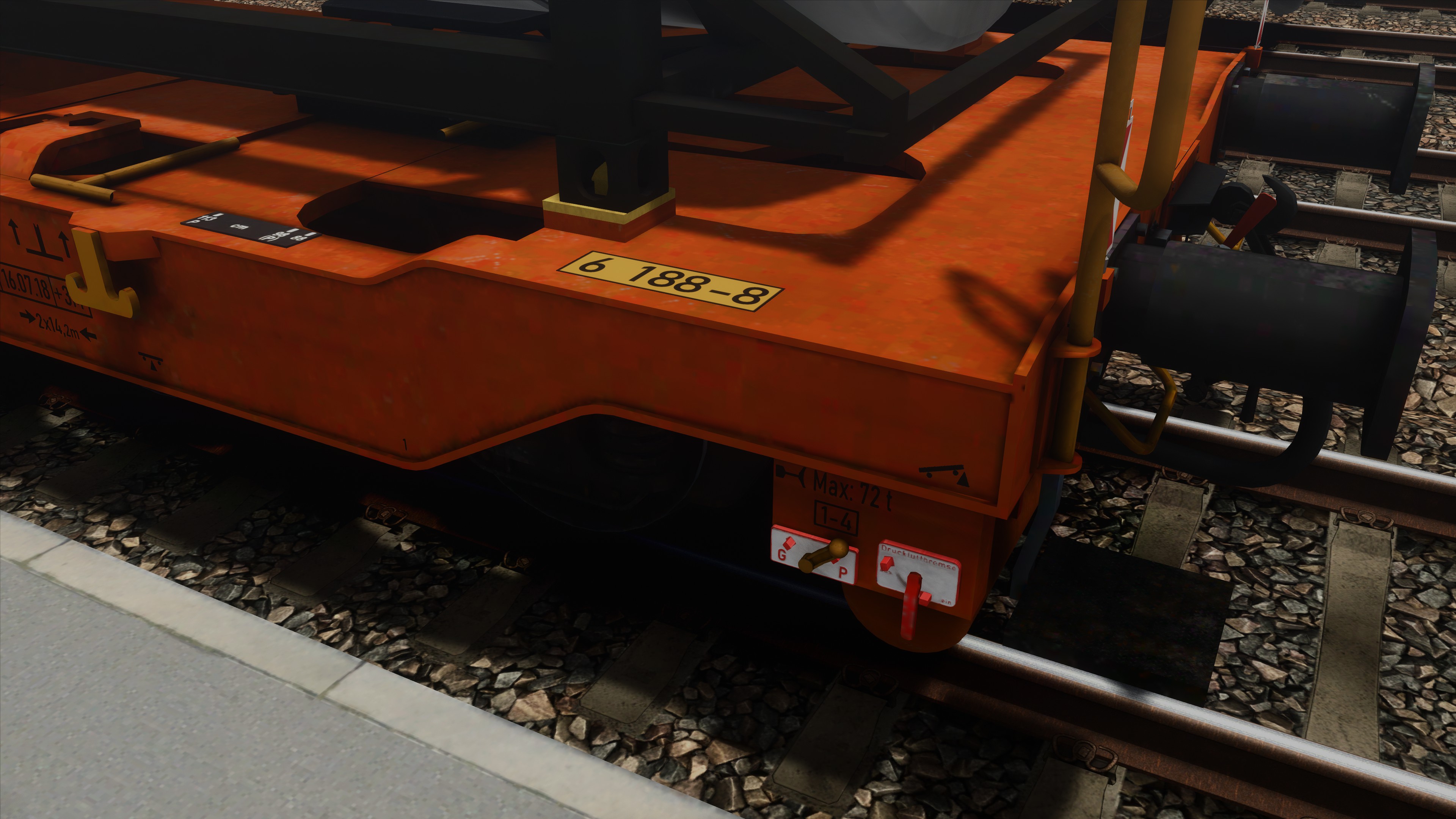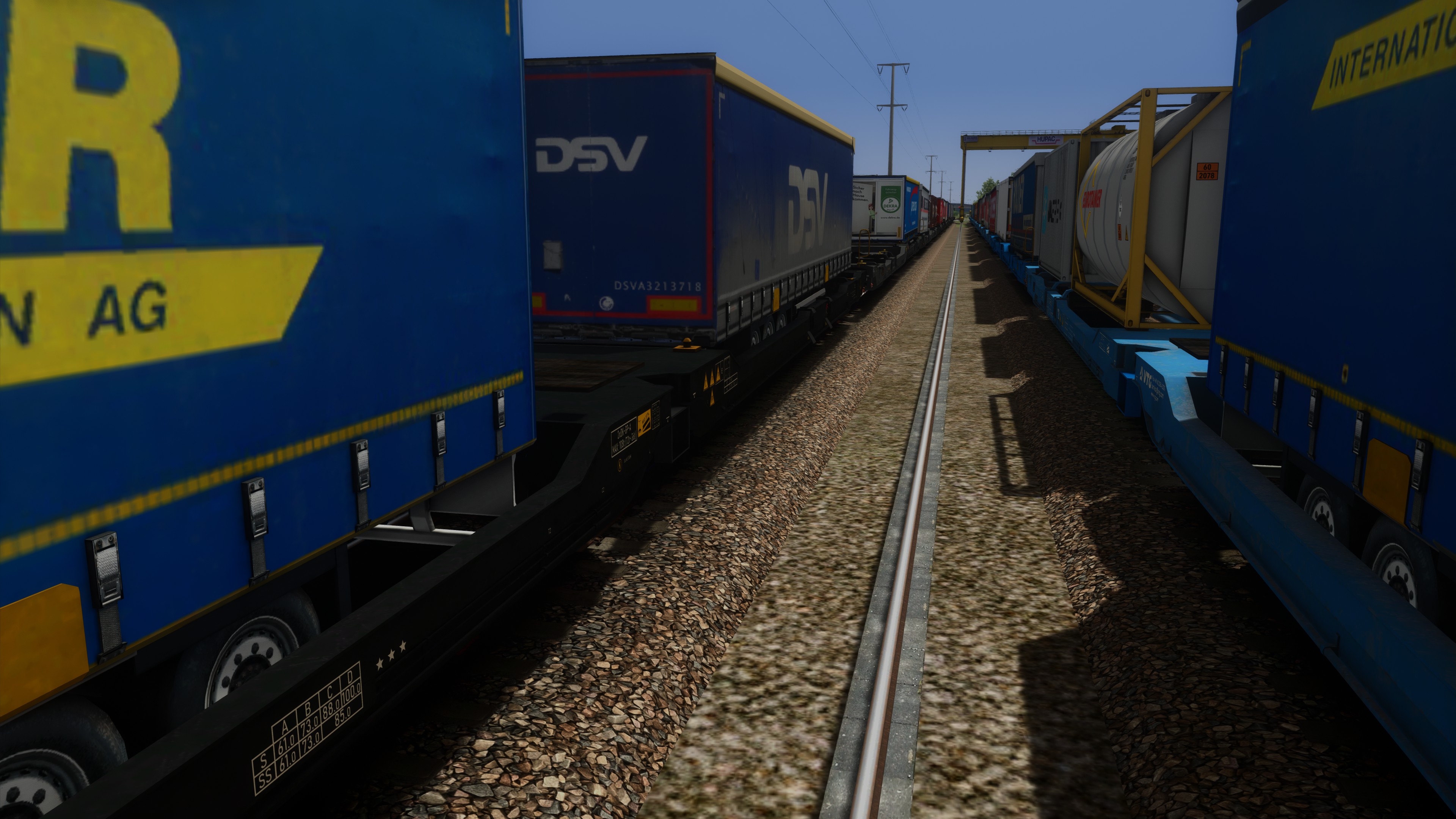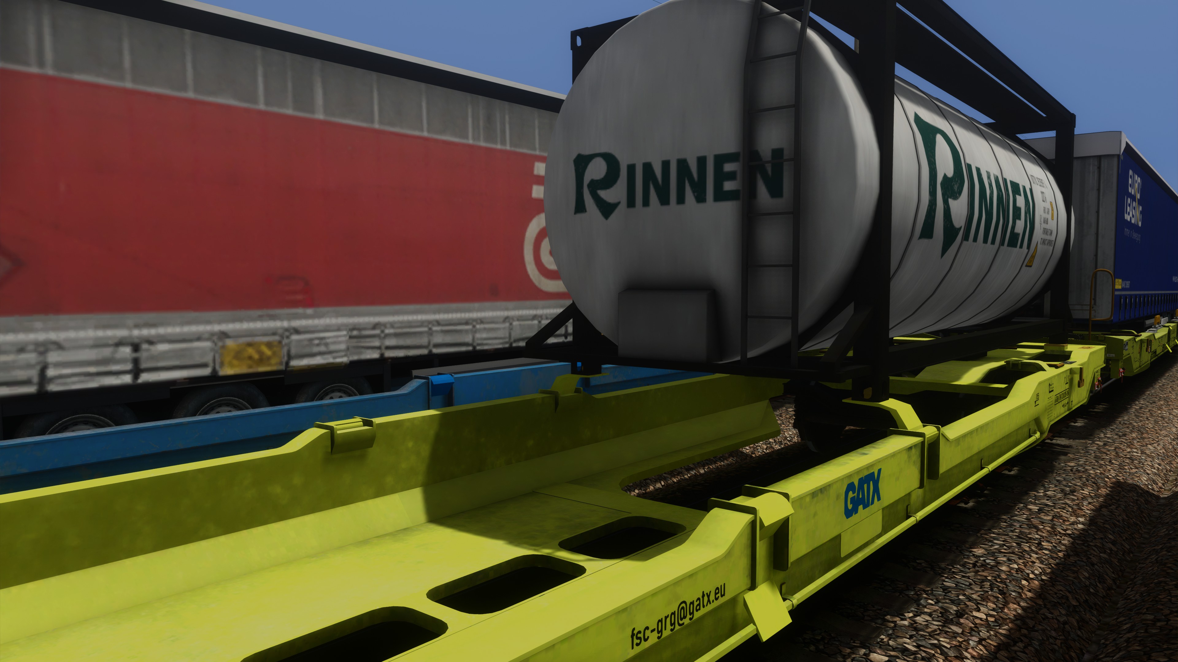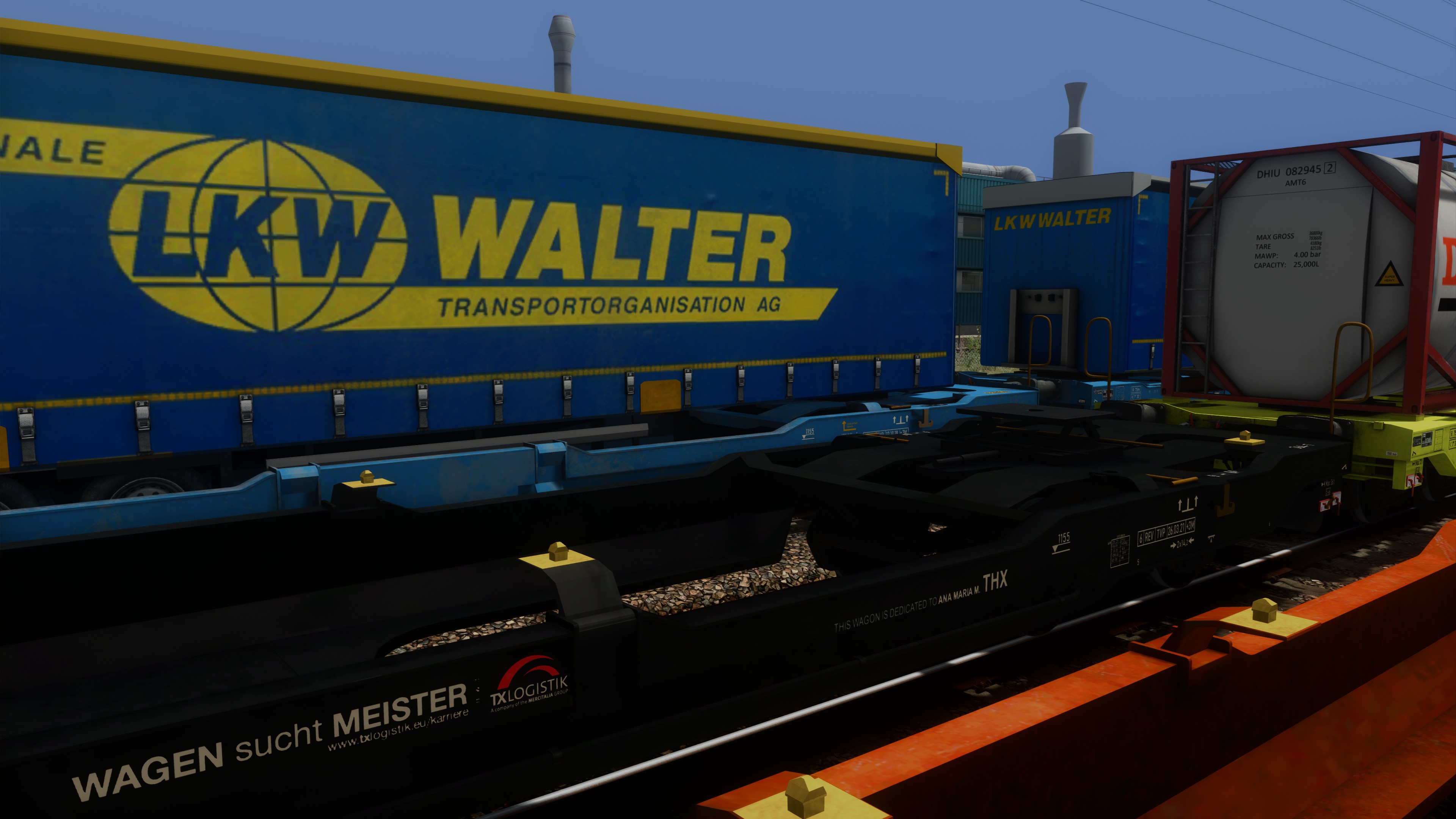 Unter anderen erhielten die Wagen so komplett neue, realitätsgetreu positionierte Beschriftungen (inkl. korrekte Wagennummern sowie Beschriftungen an Ober- und Stirnseiten), ein Handbremsrad beim Mitteldrehgestell sowie zusätzliche Klappriegel für 40- und 20-Fuss-Container /-Wechselbehälter. Für zusätzliche realitätsgetreue Beladungsvarianten werden die Auflieger von RDF sowie zusätzliche darauf aufbauende Varianten mitgeliefert. Herzlichen Dank für die Erlaubnis zur Verwendung! Weiter sind Tanktainer der Firma Bertschi und Wechselbrücken verschiedener Firmen enthalten, ebenso Bahnladungsträger (Road-Rail-Link / R2L) zum Verlad nicht-krankbarer Auflieger (Modelle: ronald_cn, Texturen: FortyCS und ronald_cn).