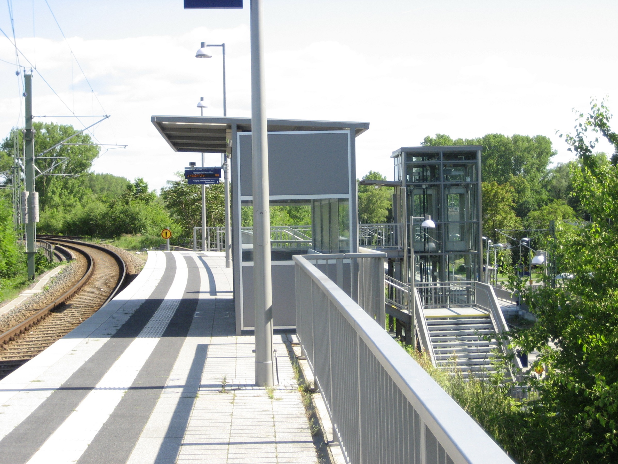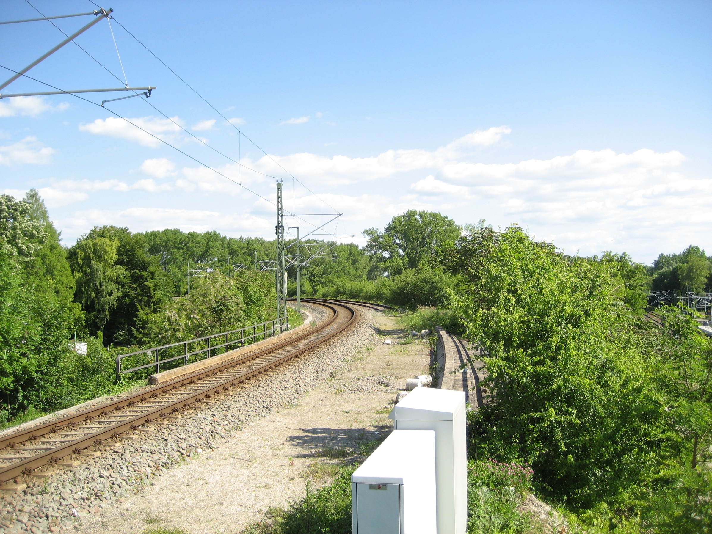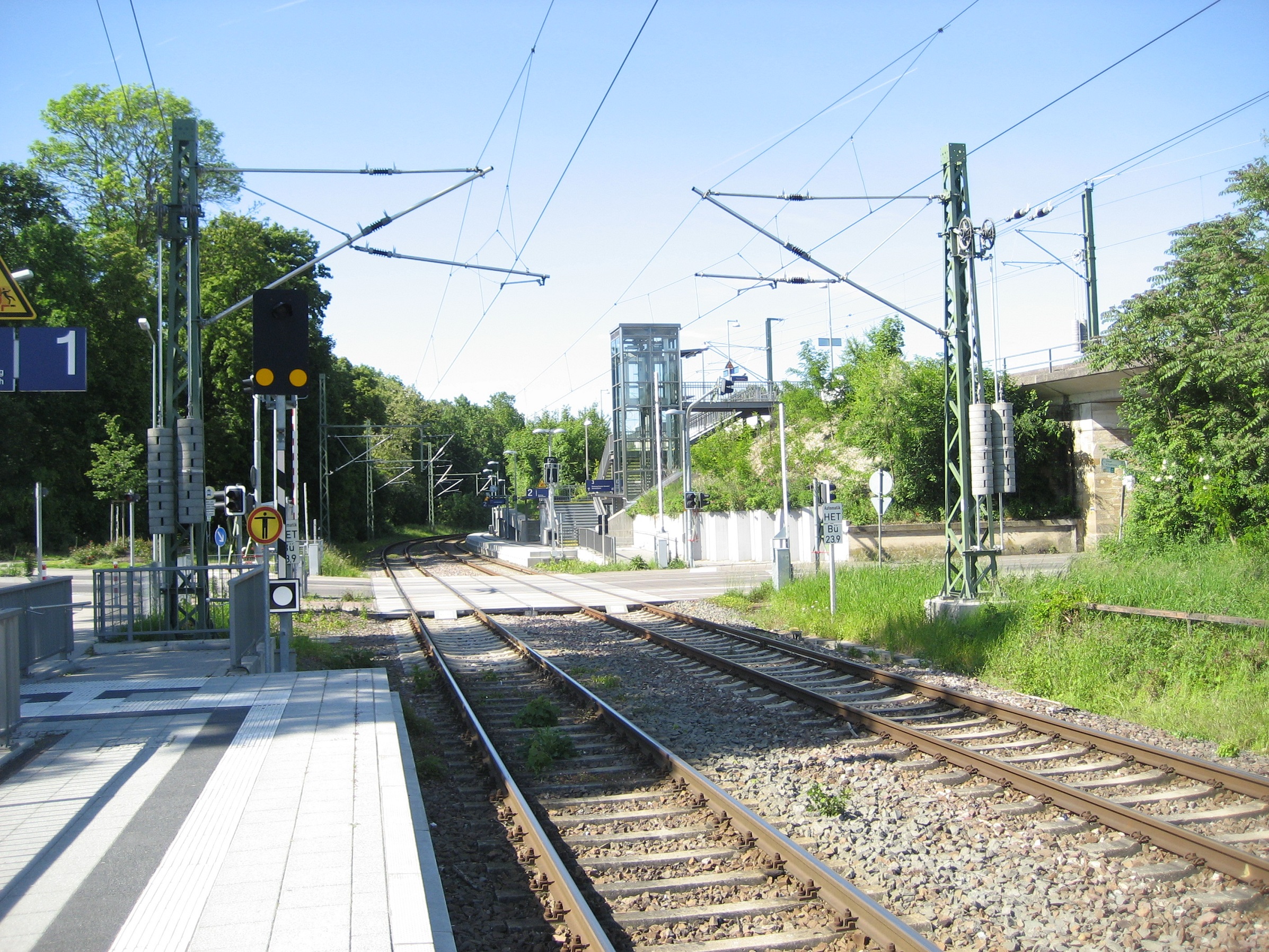 - Auf dem Planum des fehlenden Gleises auf der Brücke ist heute der Bahnsteig für das eine Gleis.