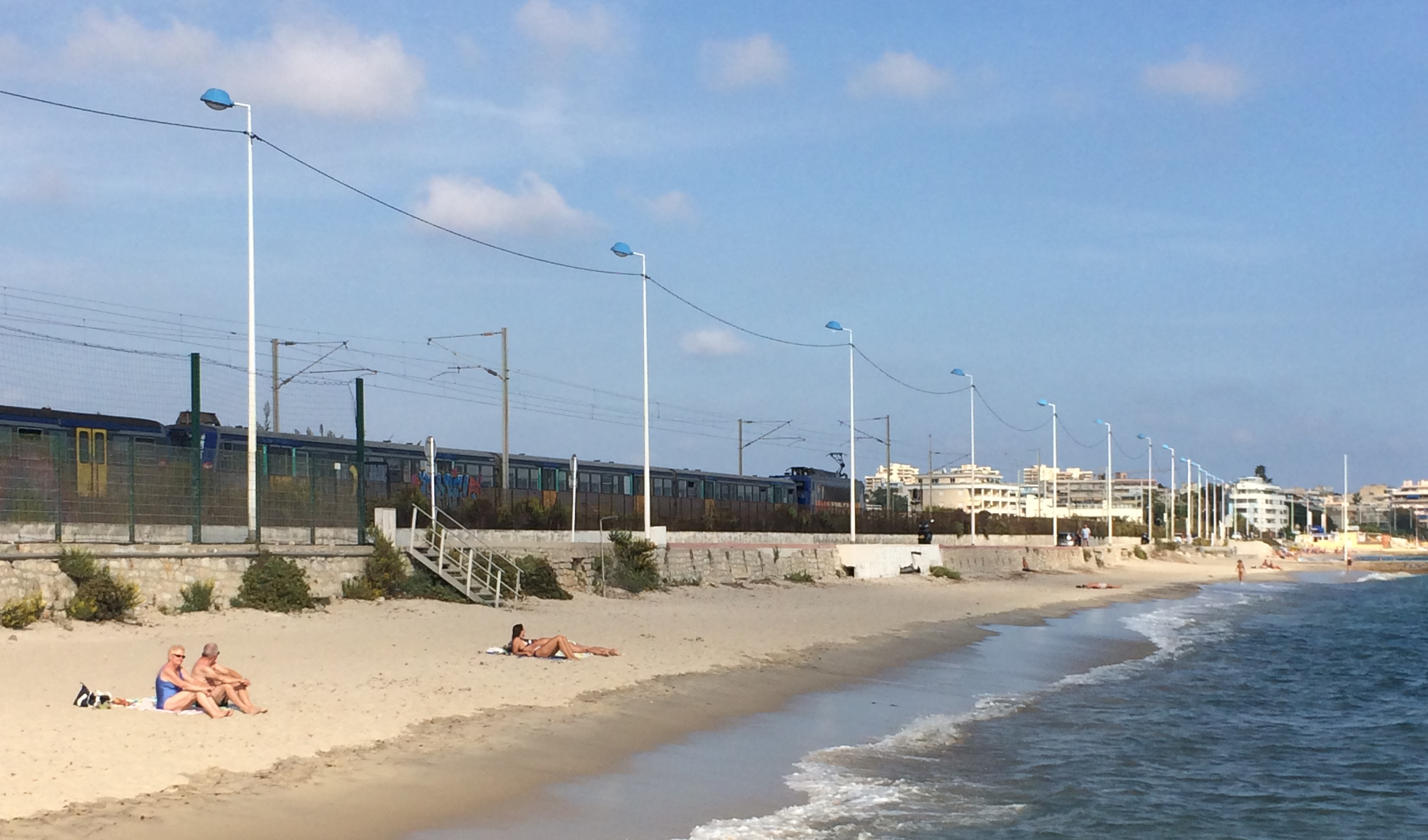 Blaue Züge, 25kV-Leitung, viel Graffiti, Eisenbahn am Strand, könnte Frankreich, Mittelmeerküste sein.