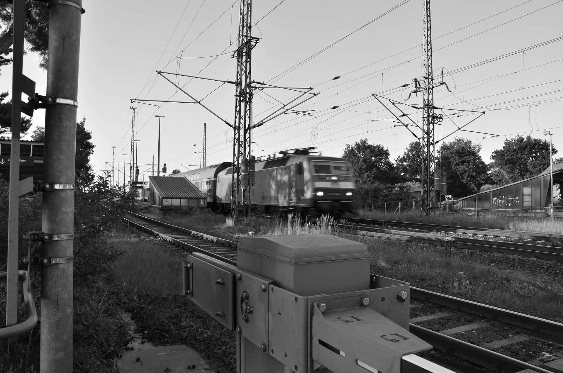 Das ist Holthusen! Die 120er sind (oder fahren noch?) eine Zeit lang mit Dostos auf Hamburg-Schwerin-Rostock gefahren. Viergleisiger Bahnhof, elekrtifiziert und ein BÜ, müsste passen. Dem MSTS sei dank!