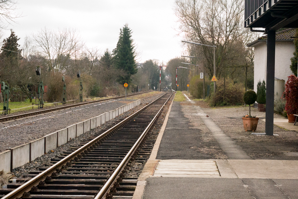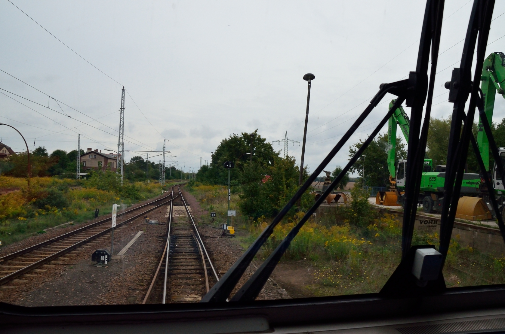 bläuliche Oberleitung, Pilzlampe, gelbe Weichengewichte und Mastschilder mit Punkten....wir sind mal wieder "drüben"