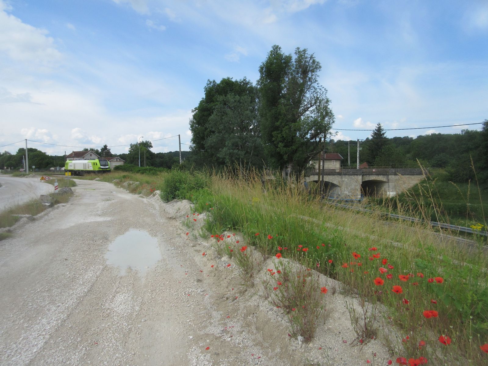 Mit dem neuen Rätsel dürften wir mal wieder in Frankreich sein. Eine wohl elektrifizierte Strecke, eine abgestellte Euro4001, dahinter die eher bescheidene Strecke mit Bahnhof, die wohl dann auch rechts über die kleine Brücke führt, darunter ein Kanal oder ein Fluß.