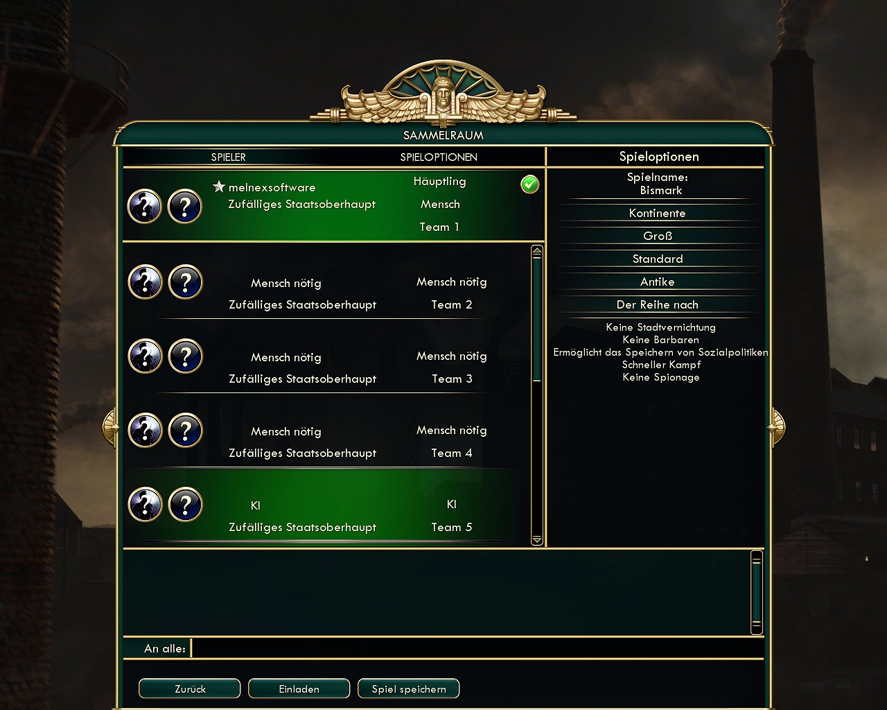 *denk* Galus Maximus! Warum liegt Rom in Südamerika!!! Ich habe gestern Abend doch nur eine Karaffe Wein getrunken. Cäsar mein Kaiser.......habt ihr schon vergessen, dass auf euren Befehl hin unsere Hauptstadt Rom nach Südamerika zu verlegen ist und das Alte stinkende Rom nieder zu brennen? Nein das habe ich nicht befohlen! Das war der blöde Zufallsgenerator der die Geschichtsbücher noch viel weniger kennt als ich. Respekt.Galus Maximus. Du erhältst den Auftrag Amsterdam in Florida einzunehmen und uns den Kopf von Wilhelm von Holland (Florida) für die XII Festspiele im Kolosseum zu Rom zu beschaffen. Ja mein geliebter Kaiser. Dein Wunsch ist mir Befehl. Soll ich nach Holland oder Florida?