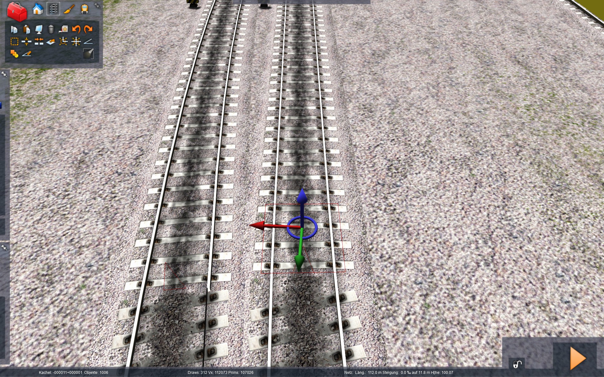 Weiter geht es, wir fliegen nun über unsere Strecke und suchen einen Geisterprellbock. Haha, da haben wir den ersten Schweinehund auch schon gefunden! Nun positionieren wir uns so, dass die Blickrichtung zum Ende des Stumpfgleises geht. Direkt hinter dem Prellbock das Gleis durch anklicken hervorheben (es erscheint dieser Gizmo und das Gleis hat einen roten Rahmen). Nun ganz kurz die Taste "c" drücken (dadurch verschiebt sich das Gleis in unserer Sichtachse von uns weg). Nun nur noch den Rückgängigbutton betätigt - und fertig ist die Laube. Auf zum nächsten Geisterprellbock!