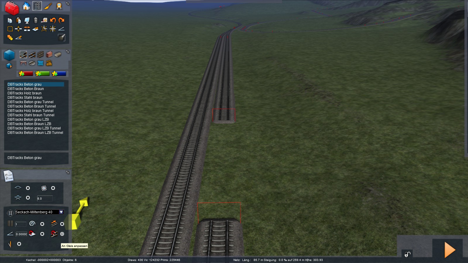 ich habe mal ein bisschen am Felberpass 2 rumgebastelt und dabei (unbemerkt) ein Stückchen Gleis gelöscht. Dieses wollte ich dann ersetzen, aber es lässt sich nur am einen Ende mit dem Bestandsgleis verbinden. Die Höhe habe ich schon angepasst und in einer Kurve liegt das Gleisstück auch nicht.