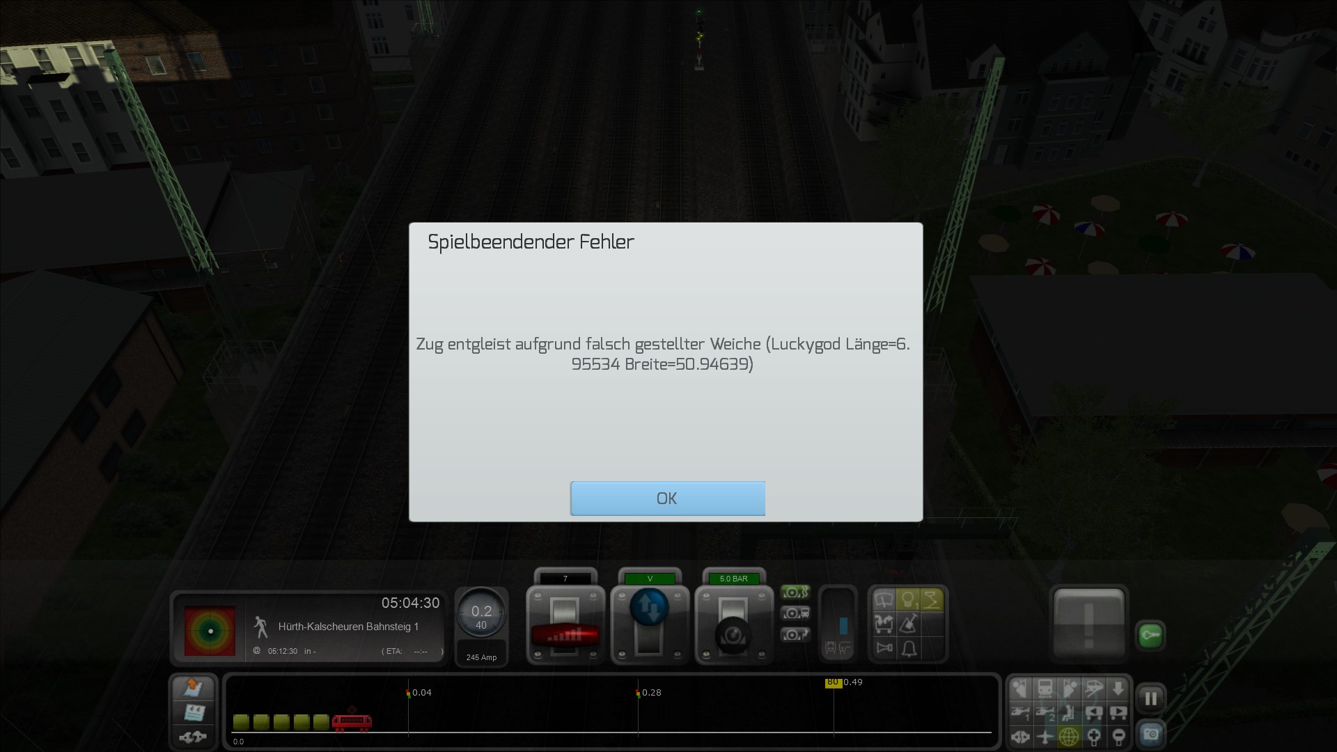 Wenn man diese dann mit dem "Allheilmittel" Strg + Q überspringt kommt es zur Entgleisung.Das Szenario ist auf Basis des TW Update erstellt worden also muß das auch zwingend installiert werden. Dann steht einer schönen Fahrt nichts mehr im Wege.