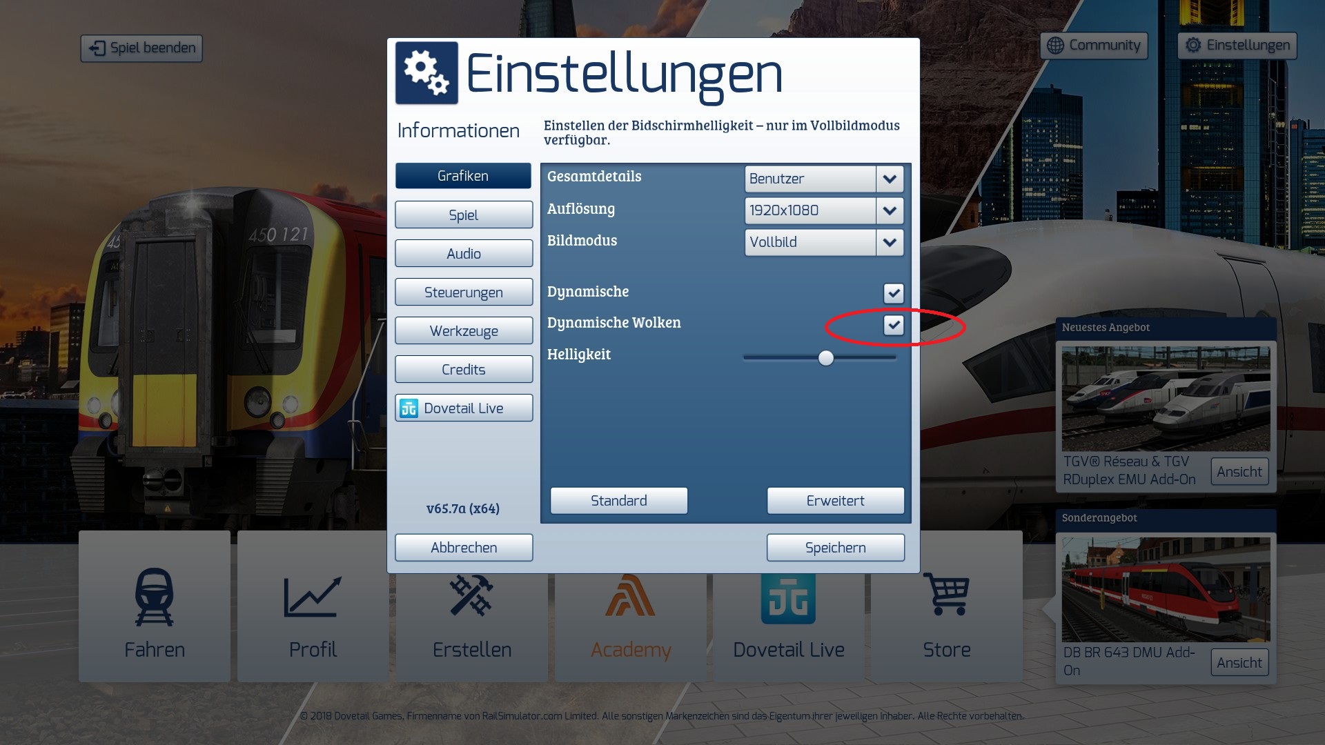 Ist diese deaktiviert dann läuft auch die erste Version des Szenarios einwandfrei. Setzt man im Menü den Haken dann bleibt es Zappenduster was ja so nicht gewollt war. Ist also eine Einstellungsgeschichte im TS wo ich aber meine das der Haken bei Dynamische Wolken generell gesetzt sein sollte.