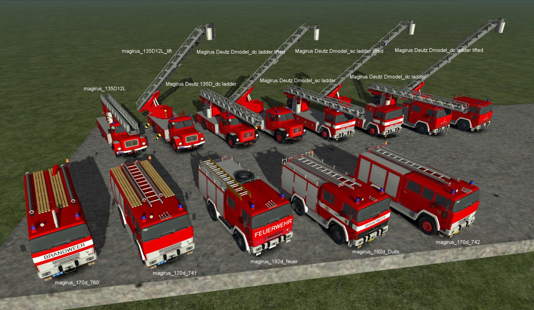 Hallo ich suche für ein Szenario (nein keinen Unfall mit Personenschaden) deutsche Einsatzfahrzeuge, am besten Hilfslöschfahrzeuge, Rettungstransportwagen und einen DB Notfallmanager. Dazu wäre natürlich das dazugehörige Personal toll. Gibt es den schon sowas? Damit ihr wisst wovon ich rede hier paar Bilder von was ich meine:
