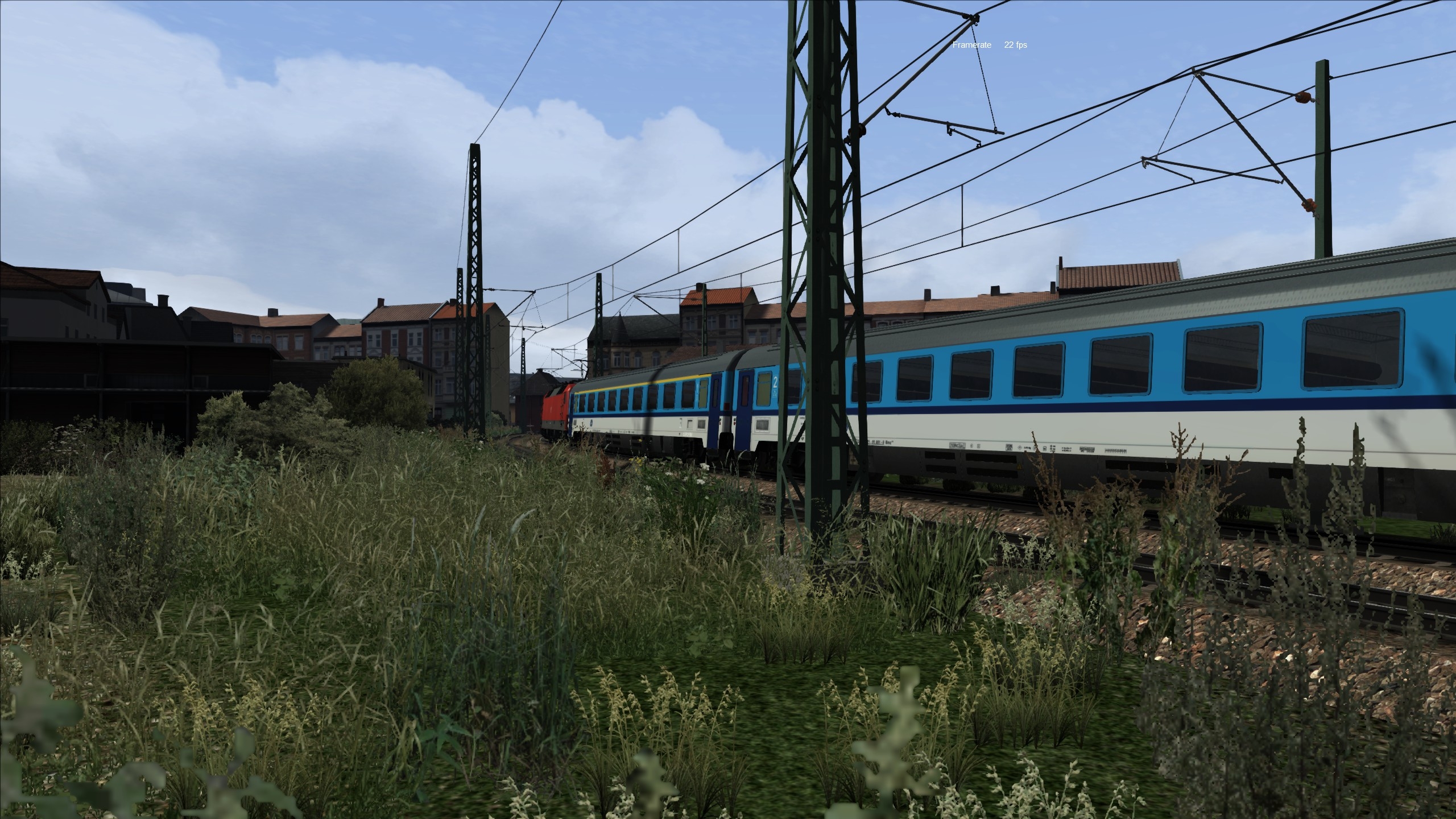 Ich habe die nördliche Ausfahrt Richtung Rostock nochmal neu gebaut. Jetzt ist auch die Kurvenüberhöhung drin und einzig die Masten der Oberleitung müssen noch korrigiert werden. Natürlich habe ich auch dort schon weiter ausgestaltet und arbeite mich derzeit von Straße zu Straße. In diesem Gebiet war früher die Kaserne der Stadt daher gibt es sehr viele sehr ähnlich aussehende Häuser welche heute als Wohnhäuser genutzt werden.