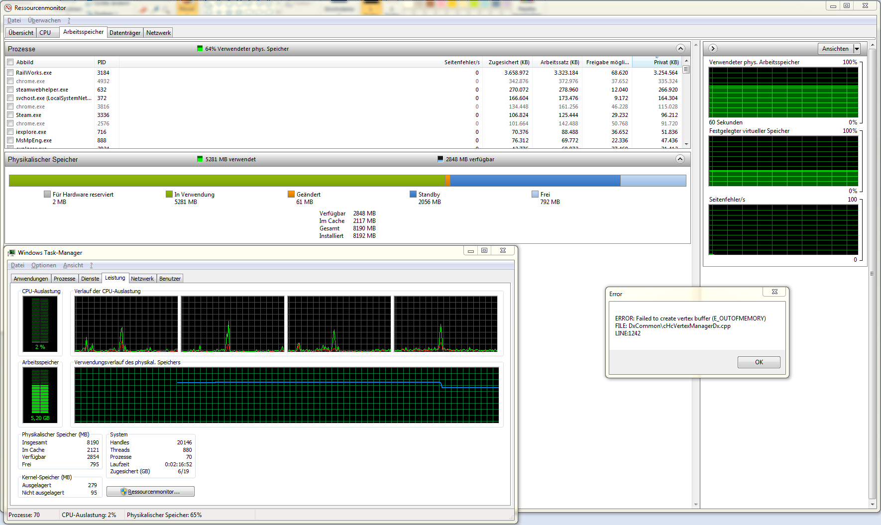 anbei mal ein Screenshot des gewöhnlichen Absturzes im TS20XX. Ursache wird wohl das bekannte Problem des Grafikspeichers sein, weil in der Architektur der Speicheranbindung keinerlei Refresh vorgesehen war und ist. Soll wohl erst in der nächsten Motherboardgeneration dann endlich mal verwirklicht werden. Arbeitsspeicher ist durch Streda.x und Chrome usw. ziemlich ausgelastet, jedoch führt dieser Overflow auch dann regelmäßig zum Absturz, wenn nur TS20XX am laufen war - denn der Arbeitsspeicher also nicht so voll war. Es muss also mit dem Grafikspeicher, bzw. dessen Verwaltung liegen.