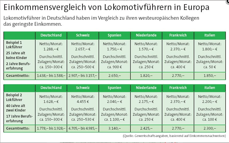Seit November 2013 existieren für Lokführer (keine Beamte) folgende mal zusammengefasste, geltende Sätze