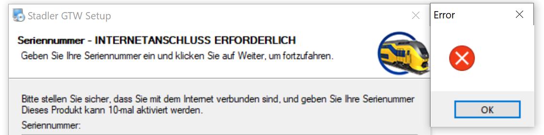 Ich wollte eben die neue Version vom Stadler GTW installieren und bekomme eine Fehlermeldung bei der Überprüfung der Seriennummer: