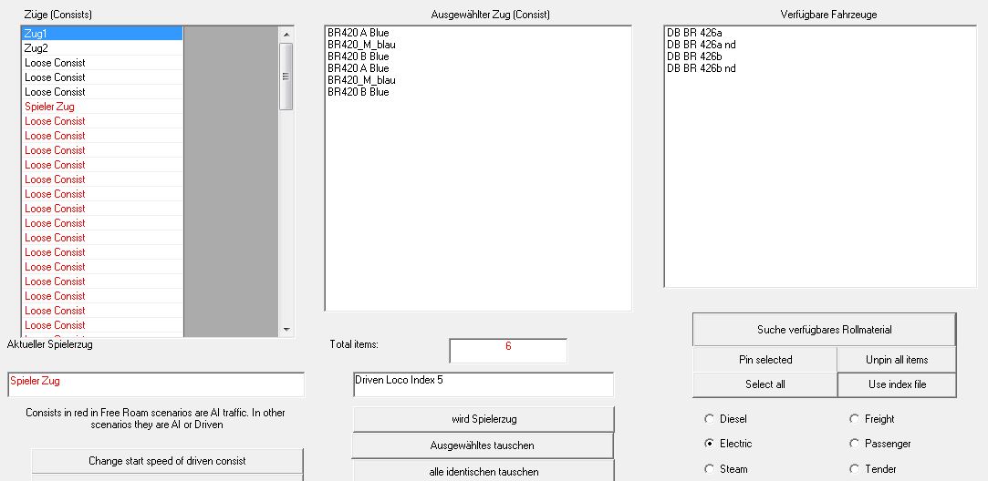 Ich habe mich inzwischen in die RW-Tools so weit eingearbeitet, dass ich erfolgreich das Rollmaterial tauschen kann welches ich nicht habe. Nun möchte ich das Szenario "(MG1968) Mit der BR 103 auf der Hagen - Siegen Strecke" fahren. Die BR103 habe ich. Auch die BR426. Aber nicht die BR420. Kann ich die beiden S-Bahnen nicht austauschen? In RW-Tools habe ich die Mittelwagen gelöscht und dann die "A" Wagen mit den "A" Wagen und B mit B getauscht. Dann kommt aber eine Fehlermeldung mit diesem "LogMate". Sogar der Spielerzug hat dann plötzlich einen LogMate Fehler. Habe auch andere Kombinationen versucht mit den "nd" Wagen der 426. Scheint aber nicht zu funktionieren. Auch wenn ich nur eine 2teilige BR426 rein kopiere und alle anderen Teile der BR420 lösche kommt die Fehlermeldung. Und wenn ich trotzdem spiele, steht die S-Bahn im Weg.