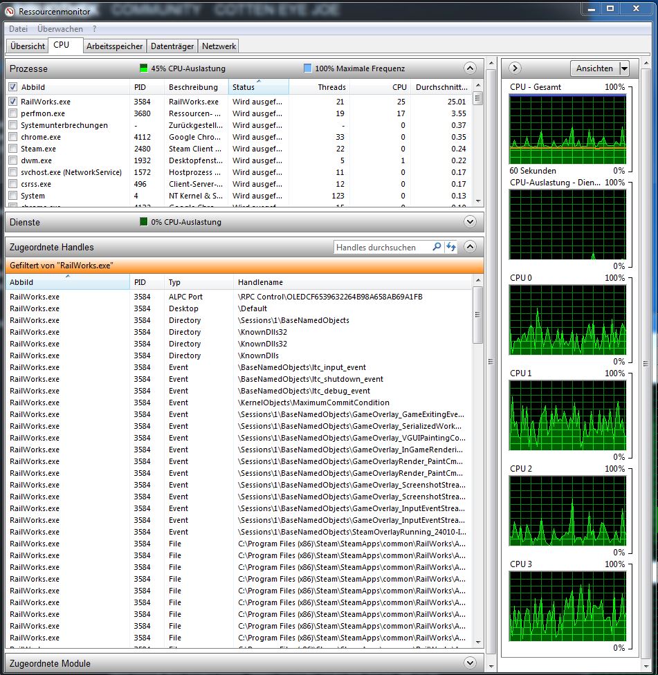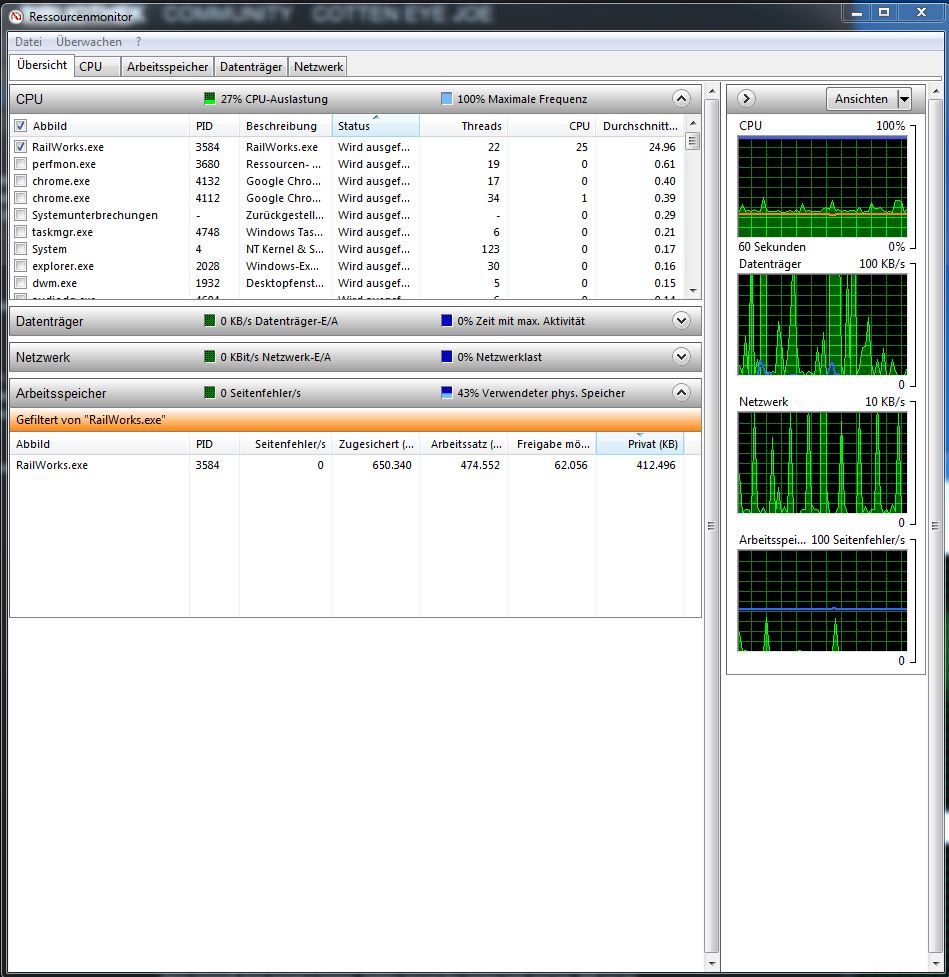 Windows Task Manager starten, Reiter "Leistung" ==> dann unten links "Ressourcenmonitor" aufrufen. Verschiedene Möglichkeiten nun, eine wäre dann beim Feld links "Prozesse" nur die railworks.exe eine Haken zu setzen (Bild).