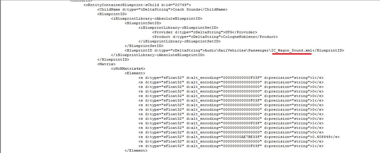 Alles anzeigen<ContainerComponent> <cEntityContainerBlueprint> <TrackTerrainInEditor d:type="bool">0</TrackTerrainInEditor> <Children> <cEntityContainerBlueprint-sChild d:id="20749"> <ChildName d:type="cDeltaString">Coach Sounds</ChildName> <BlueprintID> <iBlueprintLibrary-cAbsoluteBlueprintID> <BlueprintSetID> <iBlueprintLibrary-cBlueprintSetID> <Provider d:type="cDeltaString">virtualRailroads</Provider> <Product d:type="cDeltaString">vR_Bpmbdzf_IC</Product> </iBlueprintLibrary-cBlueprintSetID> </BlueprintSetID> <BlueprintID d:type="cDeltaString">Audio\IC_Wagon_Sound.xml</BlueprintID> </iBlueprintLibrary-cAbsoluteBlueprintID> </BlueprintID> <Matrix> <cHcRMatrix4x4> <Element> <e d:type="sFloat32">1</e> <e d:type="sFloat32">0</e> <e d:type="sFloat32">0</e> <e d:type="sFloat32">0</e> <e d:type="sFloat32">0</e> <e d:type="sFloat32">1</e> <e d:type="sFloat32">0</e> <e d:type="sFloat32">0</e> <e d:type="sFloat32">0</e> <e d:type="sFloat32">0</e> <e d:type="sFloat32">1</e> <e d:type="sFloat32">0</e> <e d:type="sFloat32">0</e> <e d:type="sFloat32">0</e> <e d:type="sFloat32">0</e> <e d:type="sFloat32">1</e> </Element> </cHcRMatrix4x4> </Matrix> <ParentNodeName d:type="cDeltaString"></ParentNodeName> </cEntityContainerBlueprint-sChild>An den Soundblueprints habe ich eigentlich garnichts verändert. Die sollten ja auch nicht mehr geladen werden, da ja auf andere gelinkt wird.