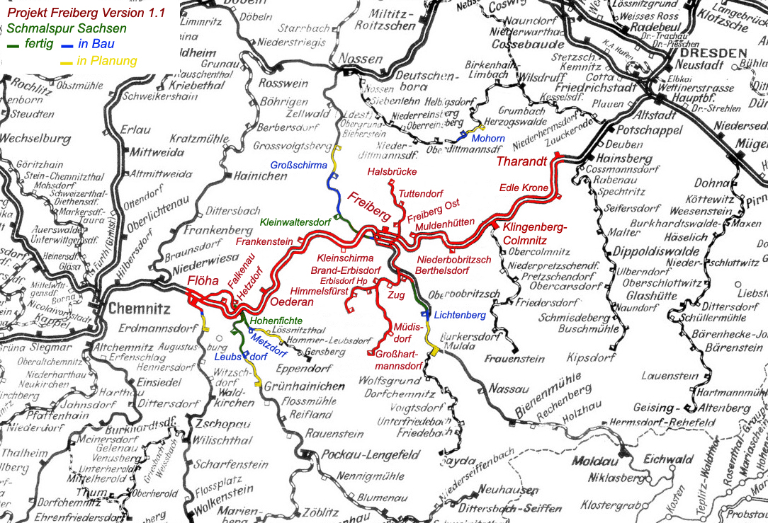 Ich finde es echt klasse dass du dich Verlängerungen von Freiberg annimmst. Deine Begeisterung für Schmallspuhrbahn in allen Ehren, aber viel spannender finde ich fast, dass du die bis in heute in Betrieb befindenlichen Nebenbahnen ab Flöha (nach Olbernhau-Grünthal) und Freiberg (nach Holzau) verlängerst.