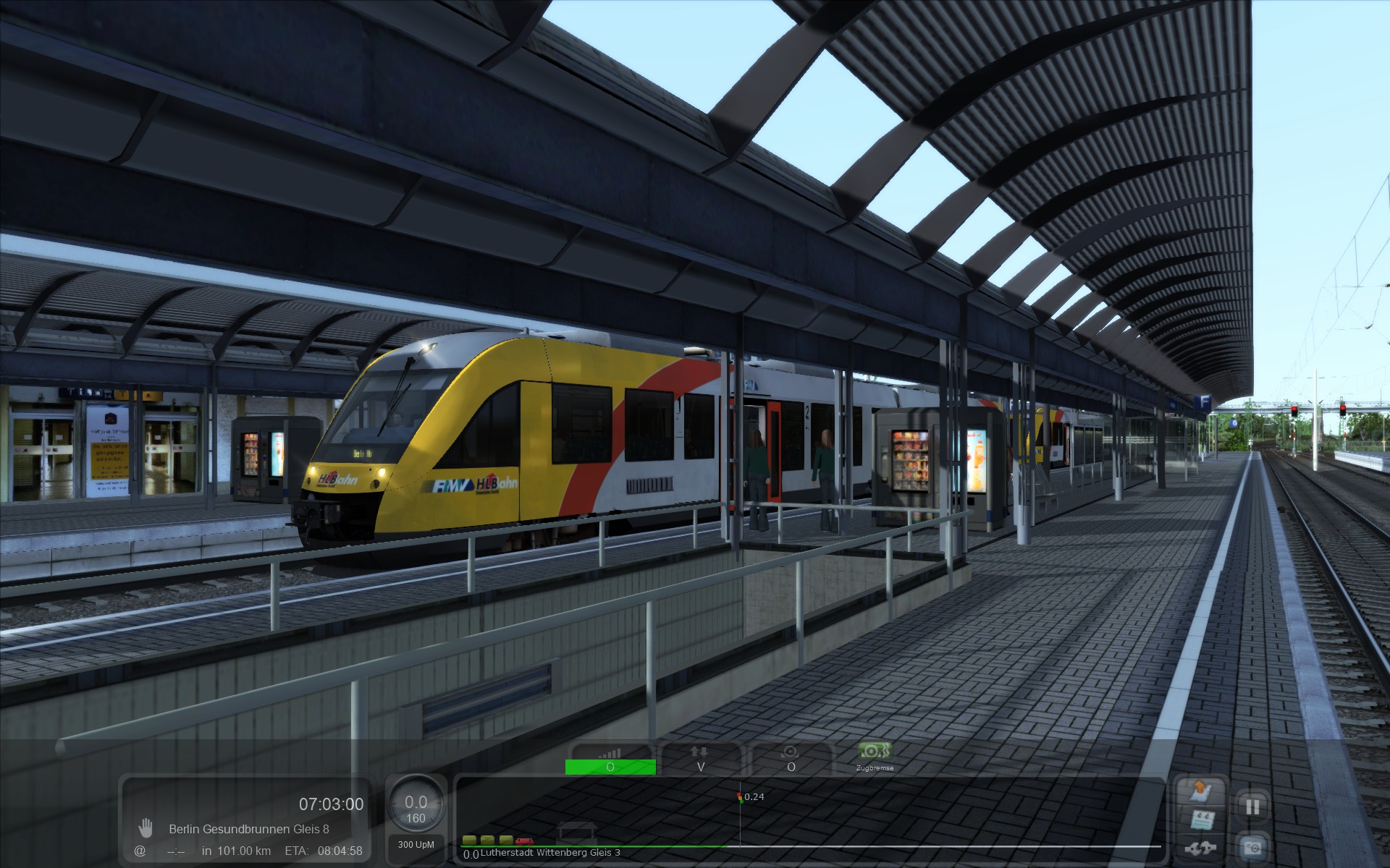 Sollte es nun die Wetterbedingungen oder andere Umstände es benötigen, kann der Tf die "Magnetische Bremse" dazu schalten - aber, sollte wohl ohne gefahren werden, weil das Bremsen damit mit hohen Kosten verbunden ist.Die Kosten haben wir hier in der Simulation nicht, weil hier die "Mg-Bremse" verschleißfrei arbeitet. Möchte man also etwas zügiger Fahren, dann bitte die mit "Mg-Bremse" bezeichnete "Dynamische Bremse" einschalten.