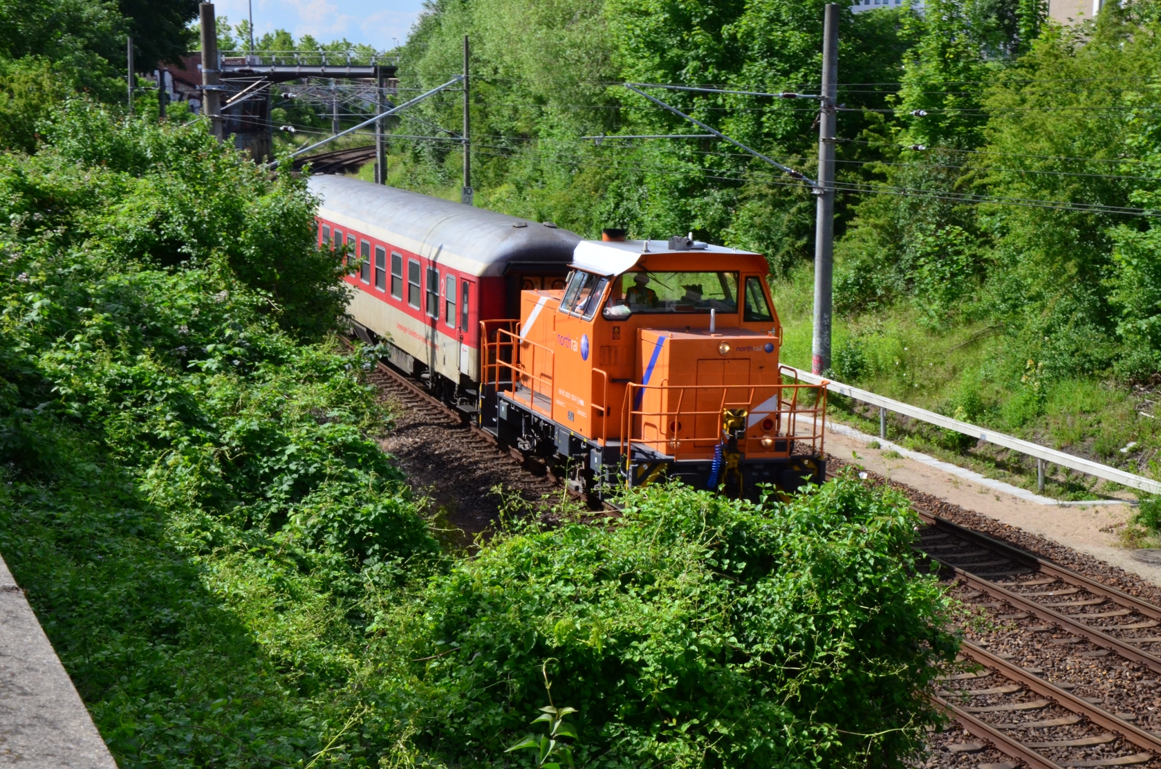 Ja korrekt - die Lok führt Überführungsfahrten für Kurswagen etc. durch. Hab sogar ein Bild von der Lok an der Storkower Straße. Allerdings ist die Lok nicht in DB-Farben lackiert sondern von "northrail" und wohl nur geleased.