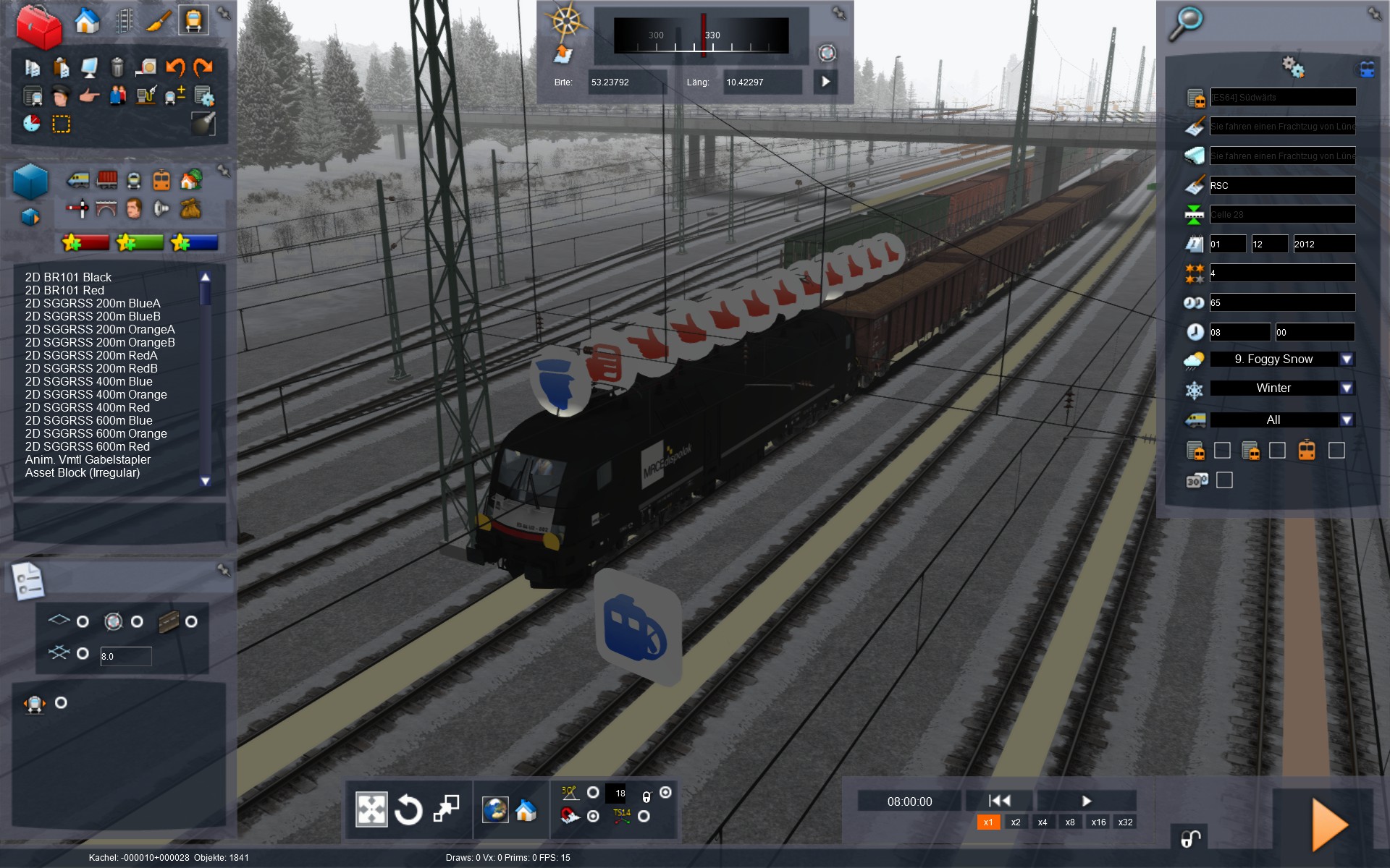Ich fahre nun also los und halte mich an die LZB-Führung, was schon merkwürdig ist weil ich dort auf der Strecke nach LZB teilweise 160 und 200 km/h fahren darf was für einen Güterzug wohl ein Problem ist. Damit kann ich aber leben, der Güterzig entgleist auch bei 165 km/h in dem Szenario nicht, also Feuer frei.