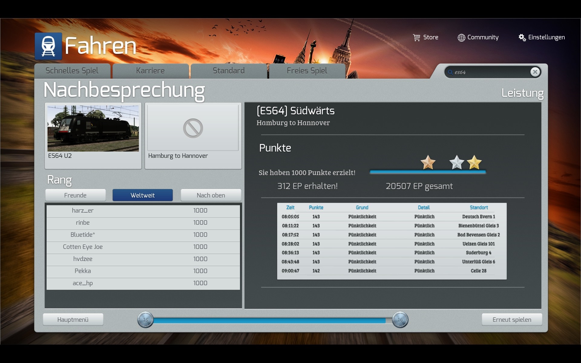 In dem Szenario war es jedenfalls vom Vor- zum Hauptsignal für den 160 km/h schnellen Güterzug viel zu wenig Anhalteweg. Noch vor dem Vorsignal ging ich auf fast volle Bremsleistung (97%) um dem Punktabzug "Einstellung Notbremse" zu entgehen, schoss jedoch noch mit 110 km/h am roten Hauptsignal vorbei und hatte nich den Hauch einer Chance, den Zug vor dem Hauptsignal anhalten zu können.