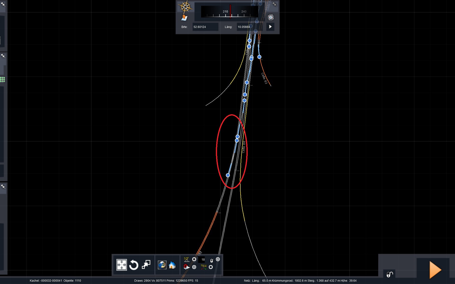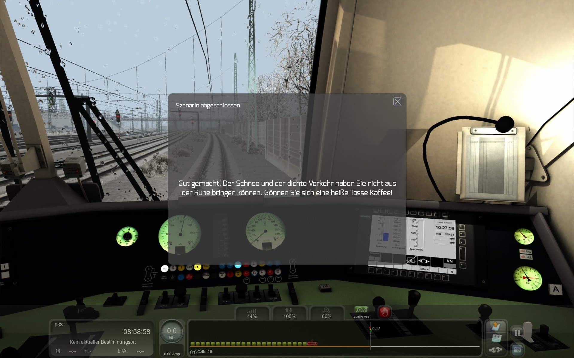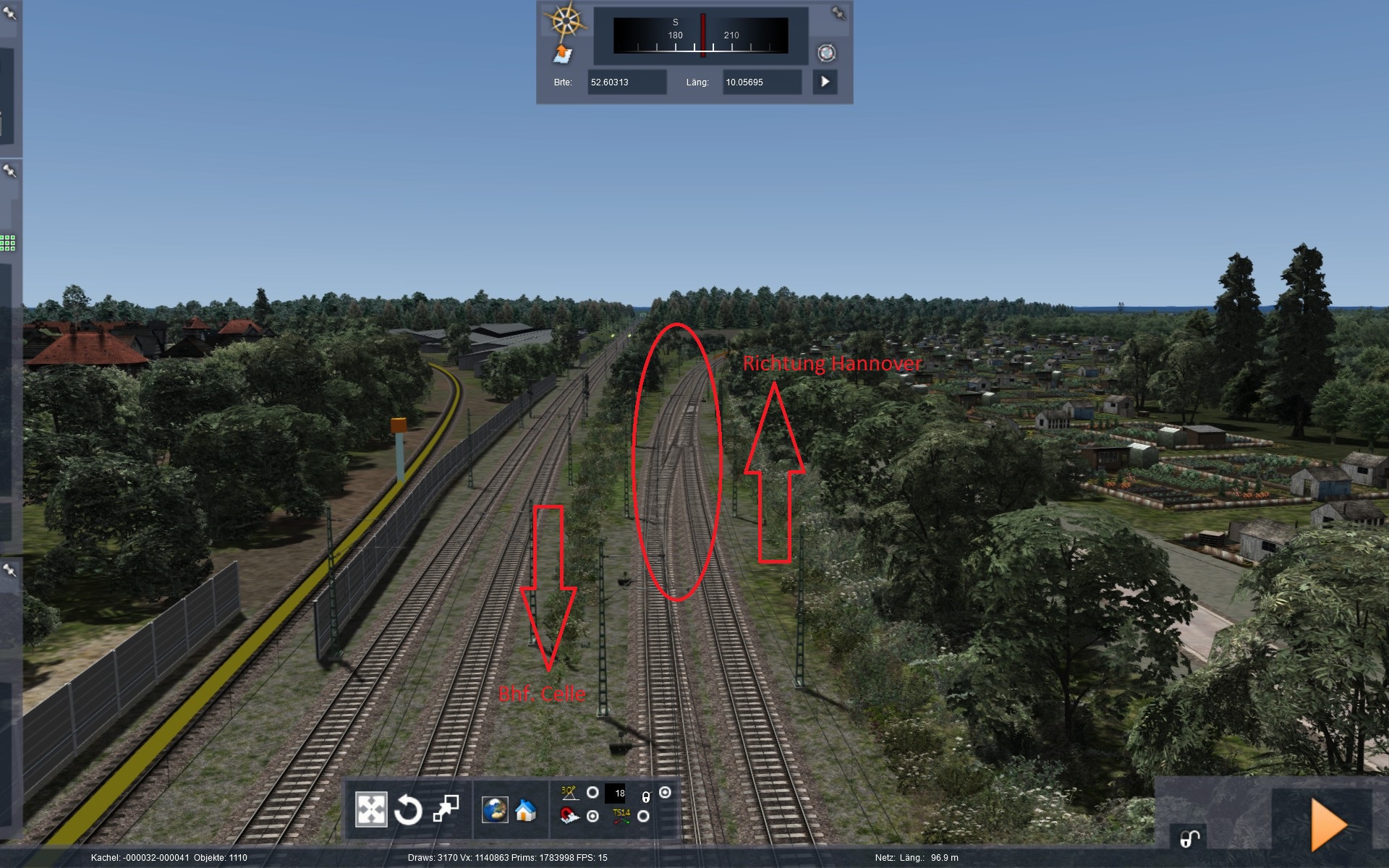 Ich fahre nun also los und halte mich an die LZB-Führung, was schon merkwürdig ist weil ich dort auf der Strecke nach LZB teilweise 160 und 200 km/h fahren darf was für einen Güterzug wohl ein Problem ist. Damit kann ich aber leben, der Güterzig entgleist auch bei 165 km/h in dem Szenario nicht, also Feuer frei.