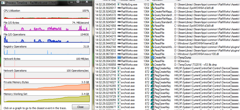 Der Train Simulator versucht (durch DirectX) direkt vor dem Absturz etwas "reservierten" Speicher zu allokieren, rennt aus dem signed Integer (2^32) und sucht sofort als nächstes den Ordner um den Dump zu plazieren. Es kann diesen Bereich einfach nicht ansprechen.